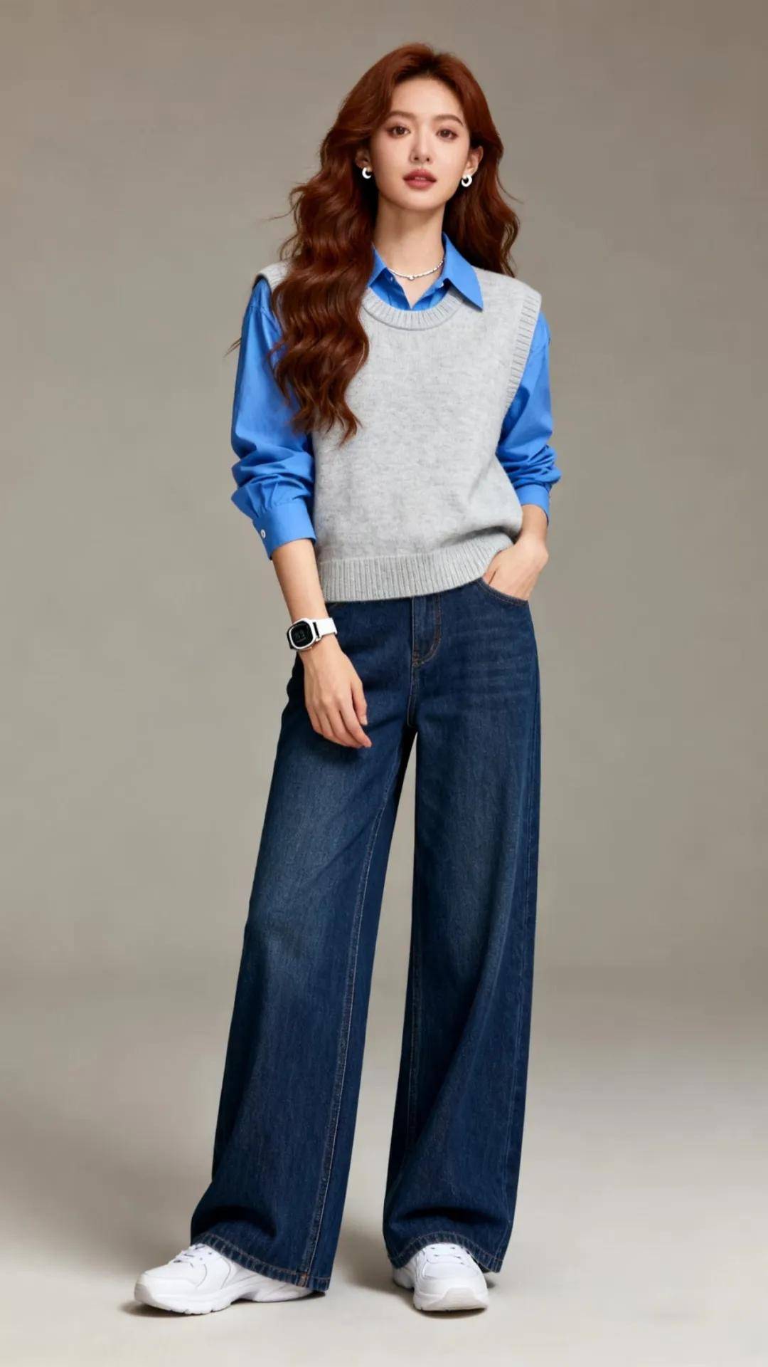 想要穿出与众不同的时髦风格,在蓝色衬衫外面叠穿一件针织背心,瞬间就有了时尚气息。