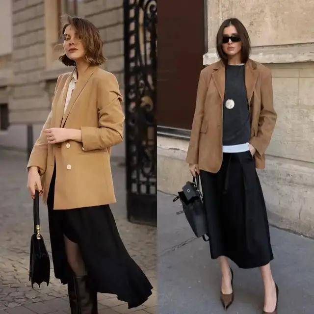 或是选择驼色系的西服,内搭灰色毛衣,叠穿白 T 恤,加上黑色直筒半裙,这样的衣服色彩组合让你看起来温柔大气,还显得高贵。