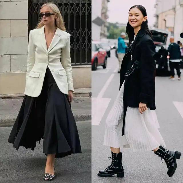 若是气质偏元气少女,则可选黑色西装,搭配一条轻盈的白色伞裙,脚踩一双马丁靴,又酷又美,甜酷感恰到好处。