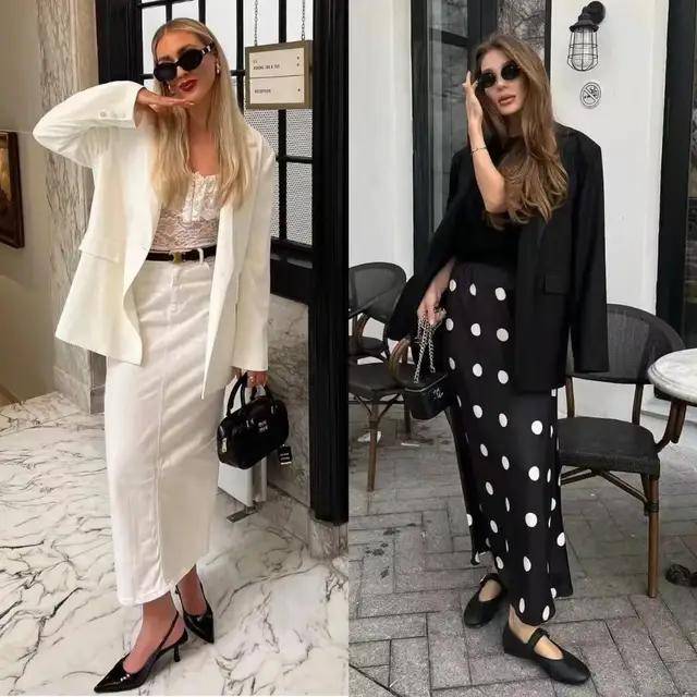 气质偏成熟女生,选一件白色西装配黑色伞裙,脚踩一双浅口单鞋,优雅得体,遮肉显瘦。