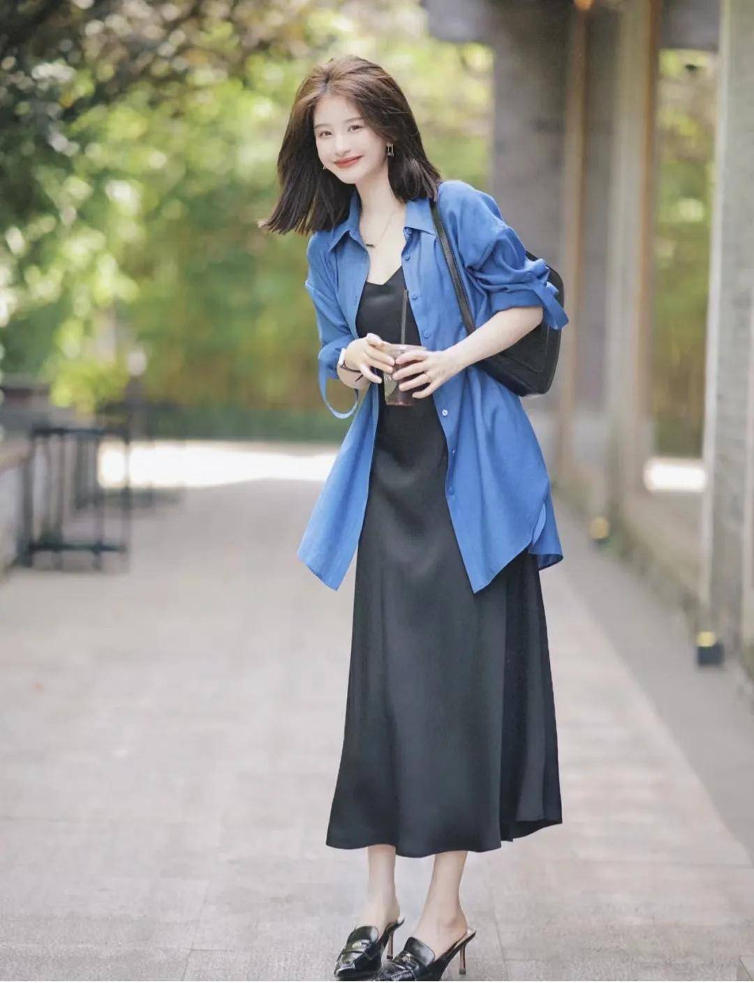 把蓝色衬衫当作薄外套来穿,内搭一件黑色吊带裙。这种穿法特别适合早春忽冷忽热的天气。衬衫的轻薄特性可以很好地应对温度的变化,而黑色吊带裙则增添了一丝时尚感,整体搭配既实用又美观。