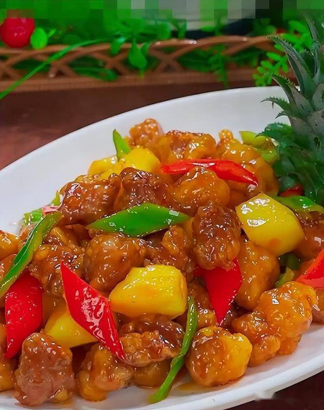 消食原理:菠萝含蛋白酶,能分解肉类蛋白质,减轻肠胃负担;青红椒的维生素C促进铁吸收。