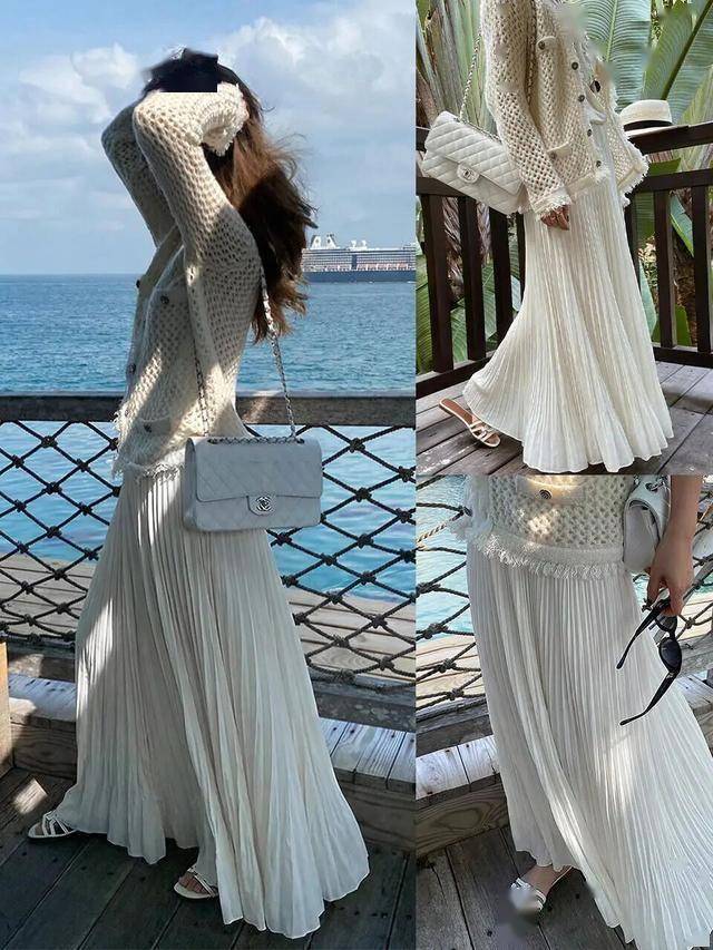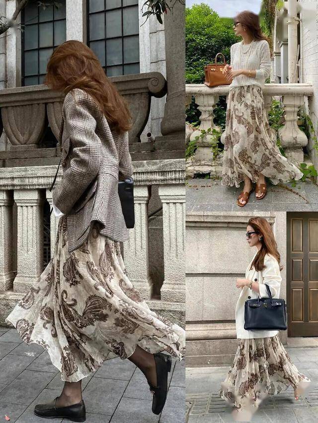 长皮衣+连衣裙:棕色长皮衣内搭碎花裙,刚柔并济(参考皮衣与裙装组合)。