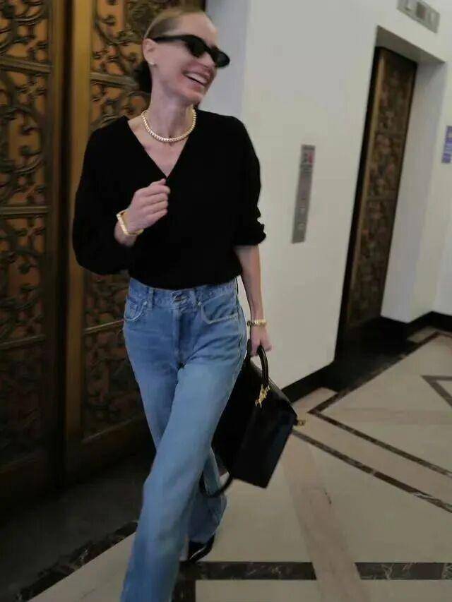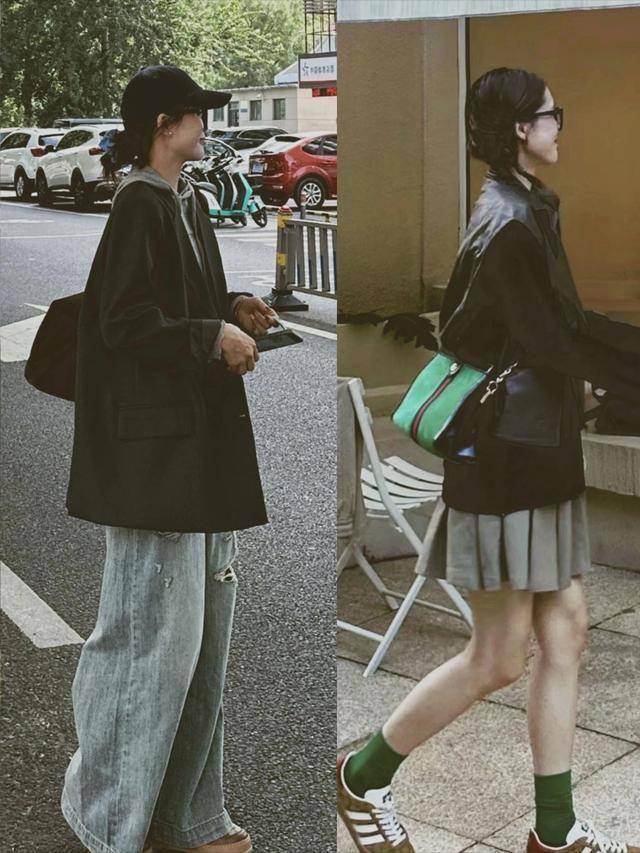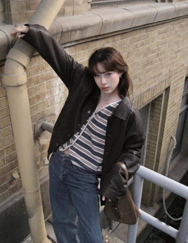 短款皮衣+低腰裤:黑色皮衣配低腰直筒牛仔裤,慵懒叛逆(参考皮衣搭配公式)。