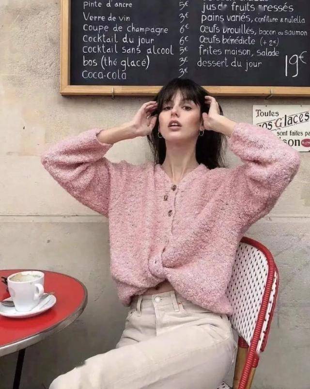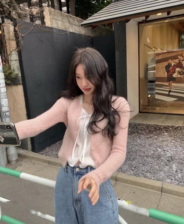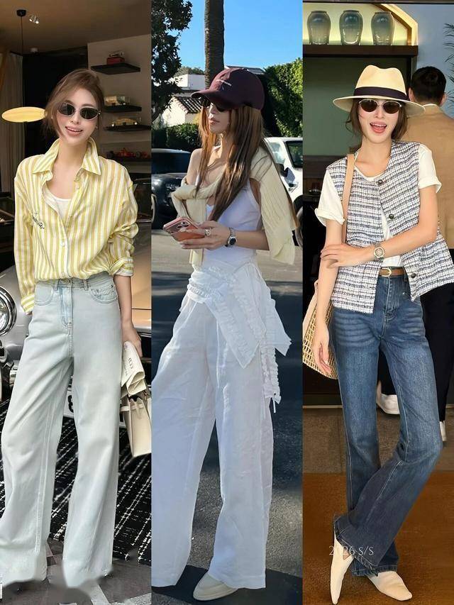 高腰直筒版型+筋骨感面料,避免臃肿(如白色牛仔九分裤配粉色V领开衫)。