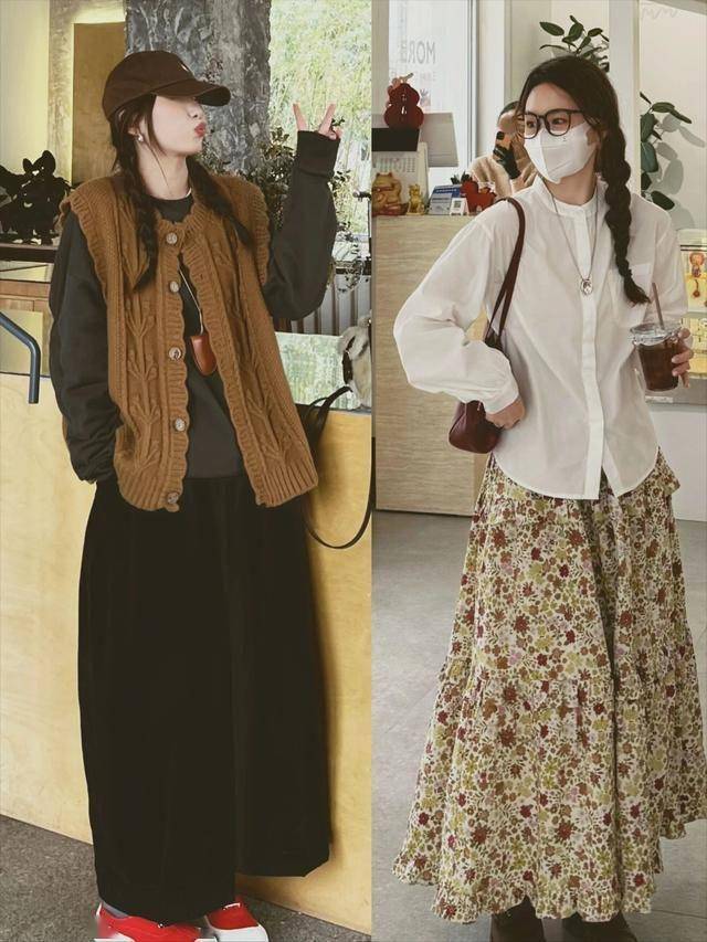 材质碰撞:针织马甲+衬衫,袖口与领口翻出,打造书卷气(参考针织马甲搭配)。