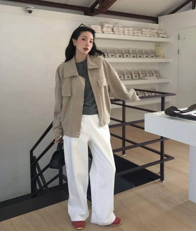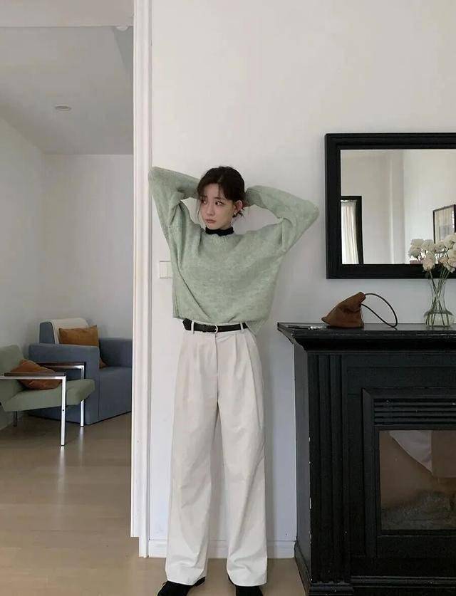 选奶油白、米白等暖调,搭配拼接色毛衣或渐变色针织衫,清爽提亮造型(参考白色裤搭配法则)。