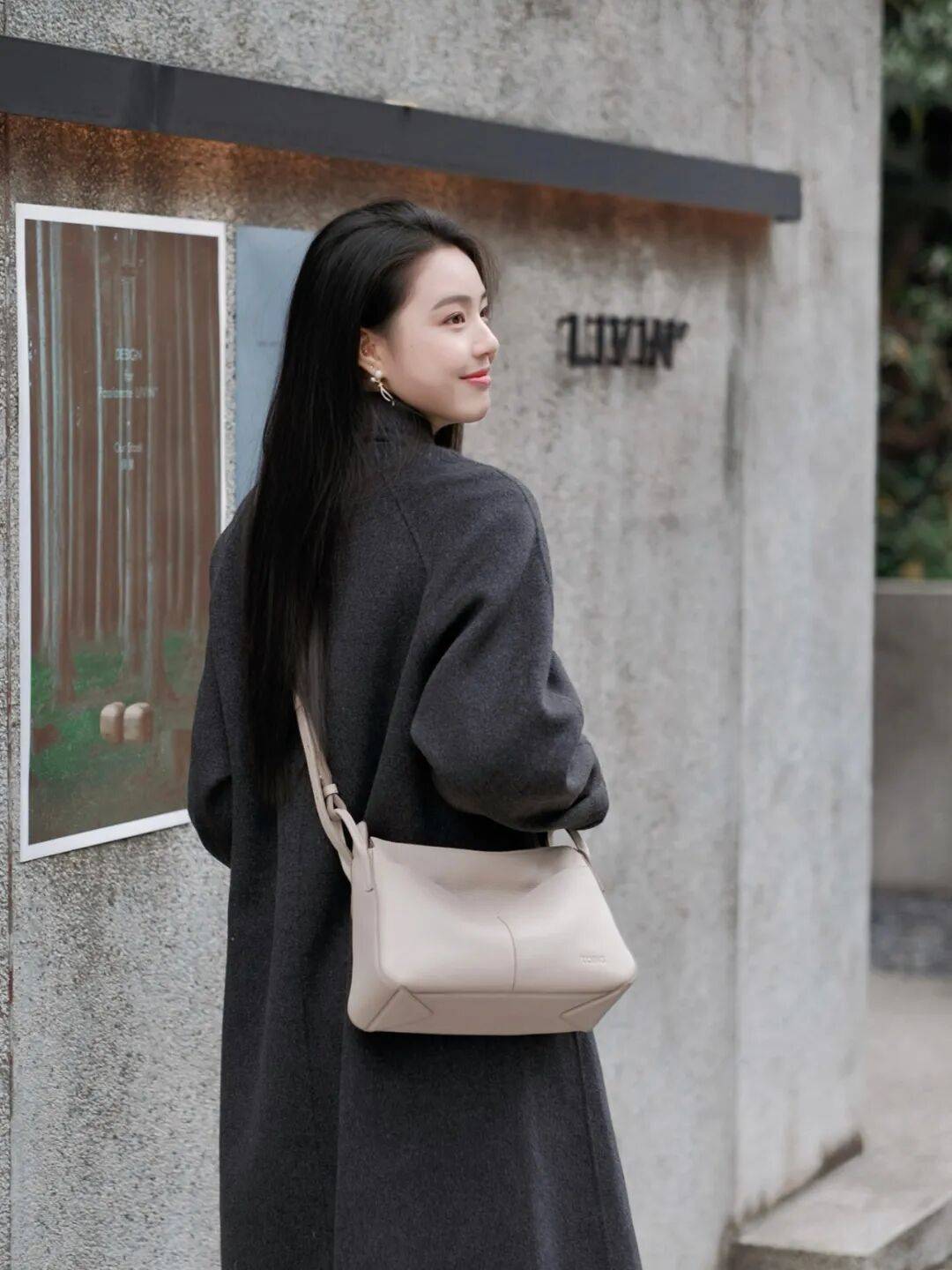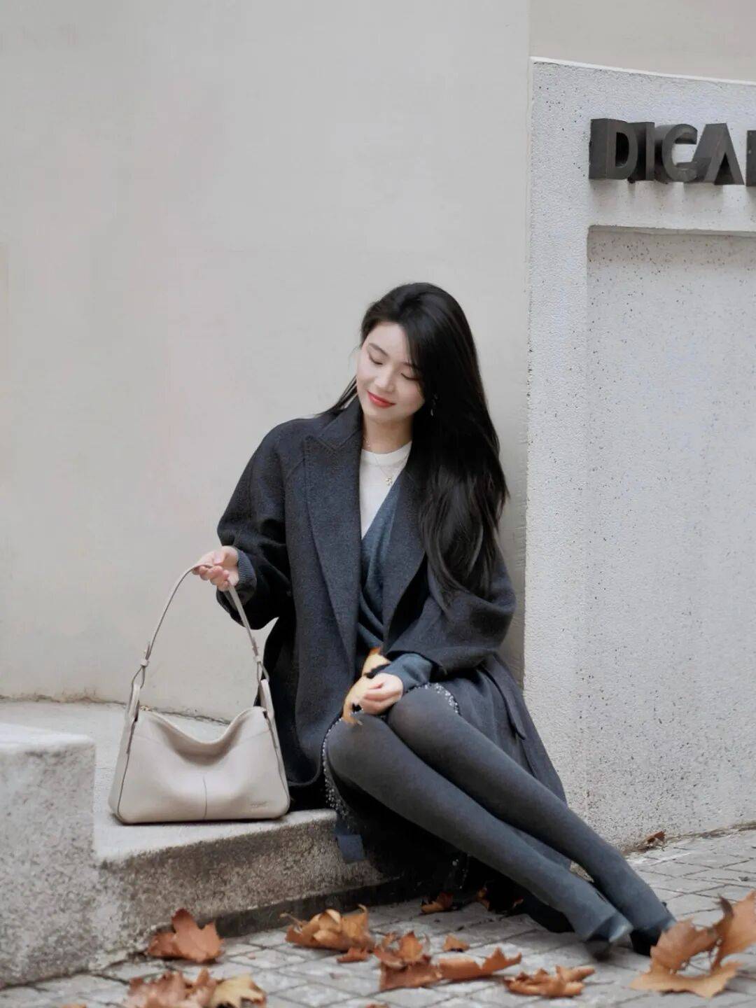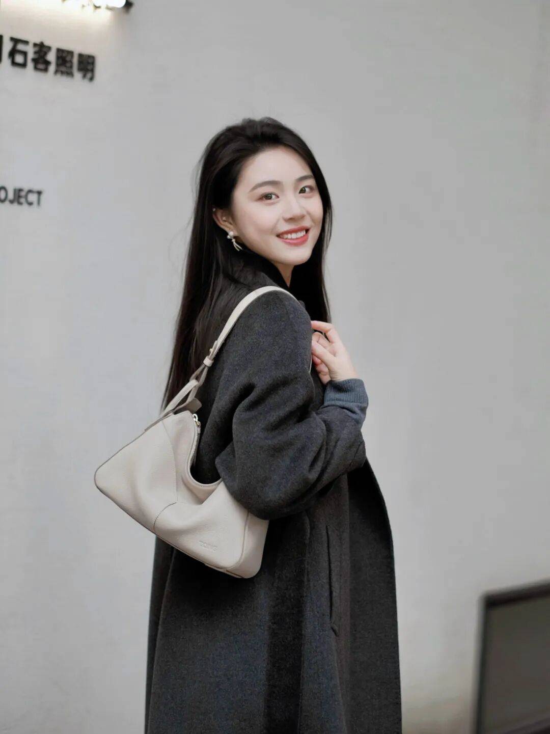 穿大衣拍照侧站时把包挎在身上,身体向前一点,头轻轻回过来对着镜头笑,大衣的背部线条和侧颜一起出现,画面会很耐看,也很出片温柔有气质。