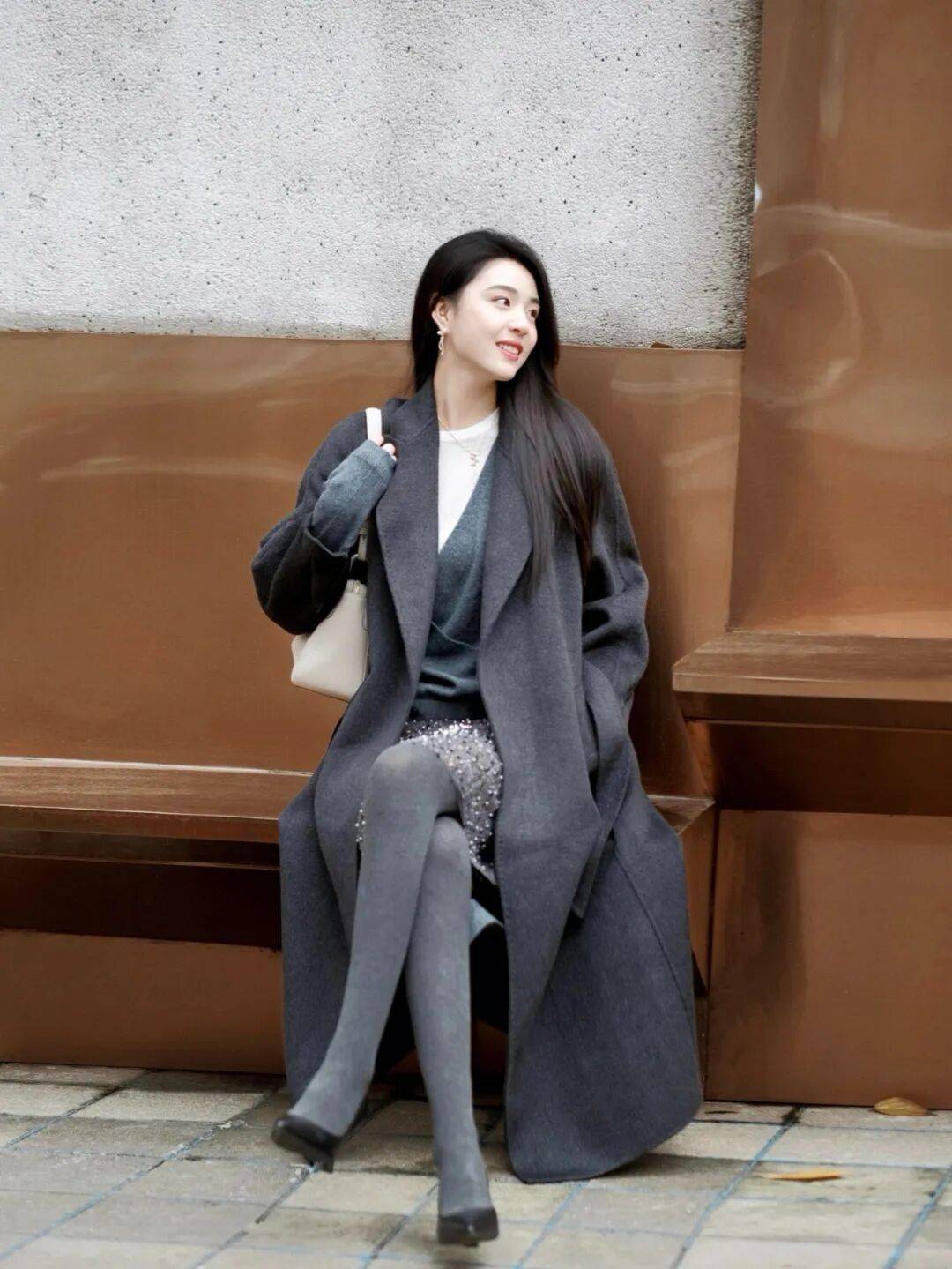 穿大衣拍照叠腿坐着会显得比较优雅,一只手托着脸,身体微微歪向一边,看镜头笑,大衣的肩线和领口都会被拍得很清楚,很适合想要气质感的画面。