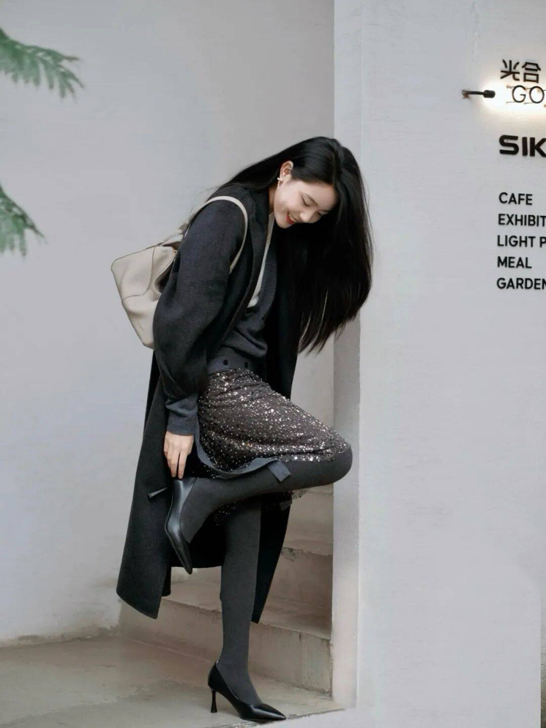 最戳人的,莫过于那一双过膝黑丝。恰到好处的长度卡在大腿处,把又直又匀的腿部线条衬得淋漓尽致,朦胧的质感裹着肌肤,一步一动间,都是藏不住的风情,把 “犹抱琵琶半遮面” 的性感分寸感玩到了极致。