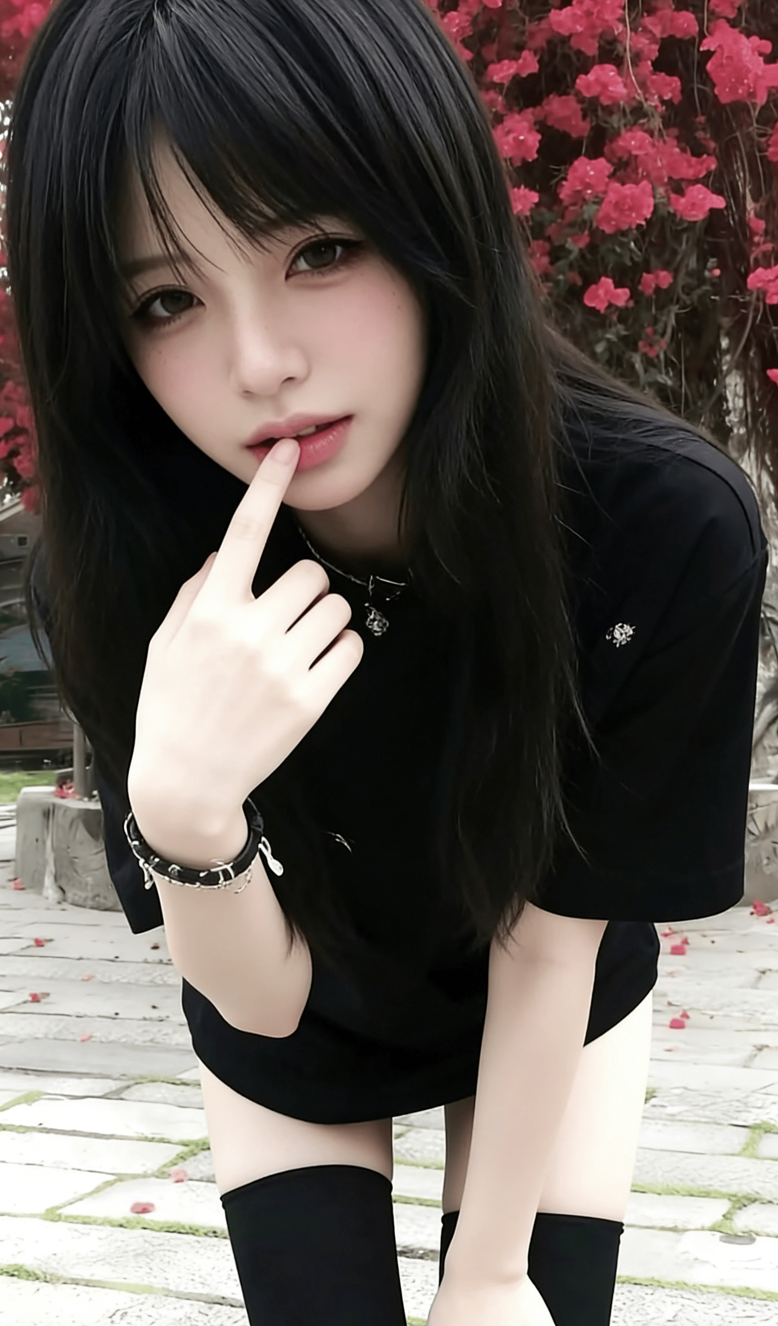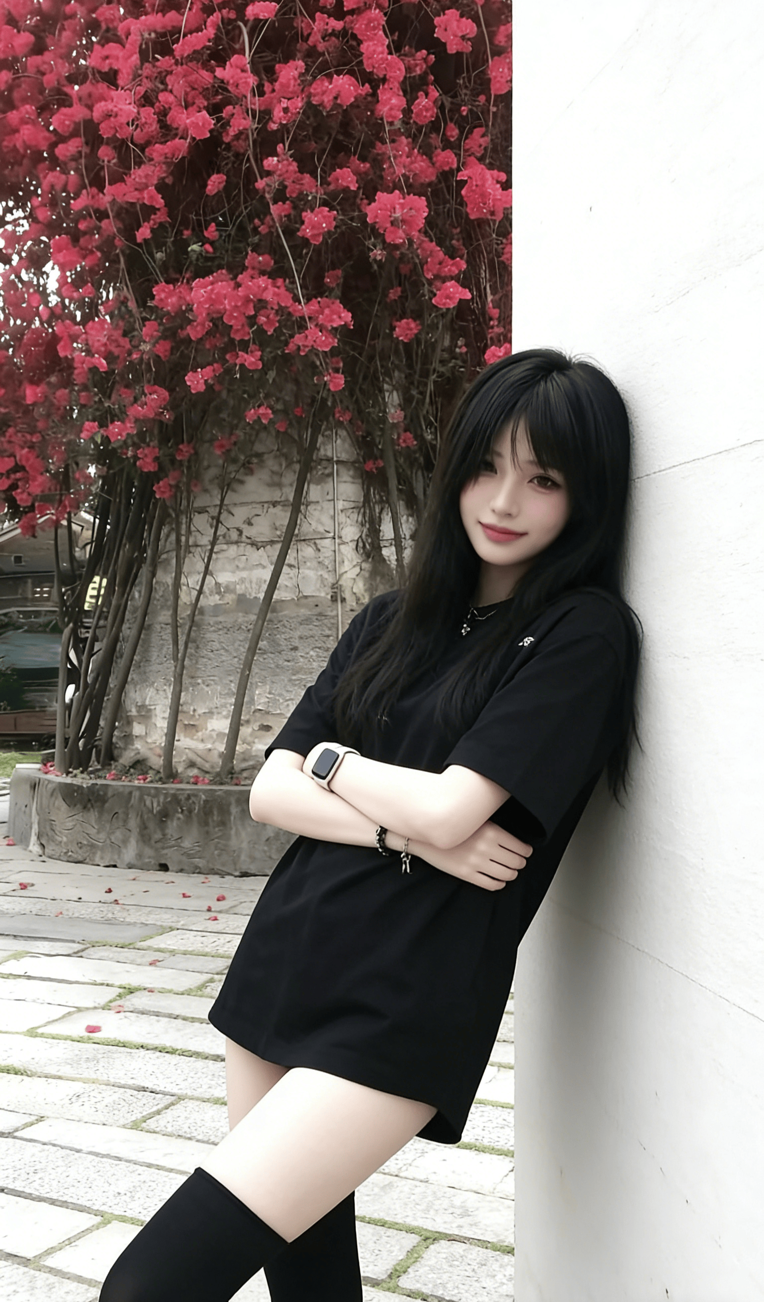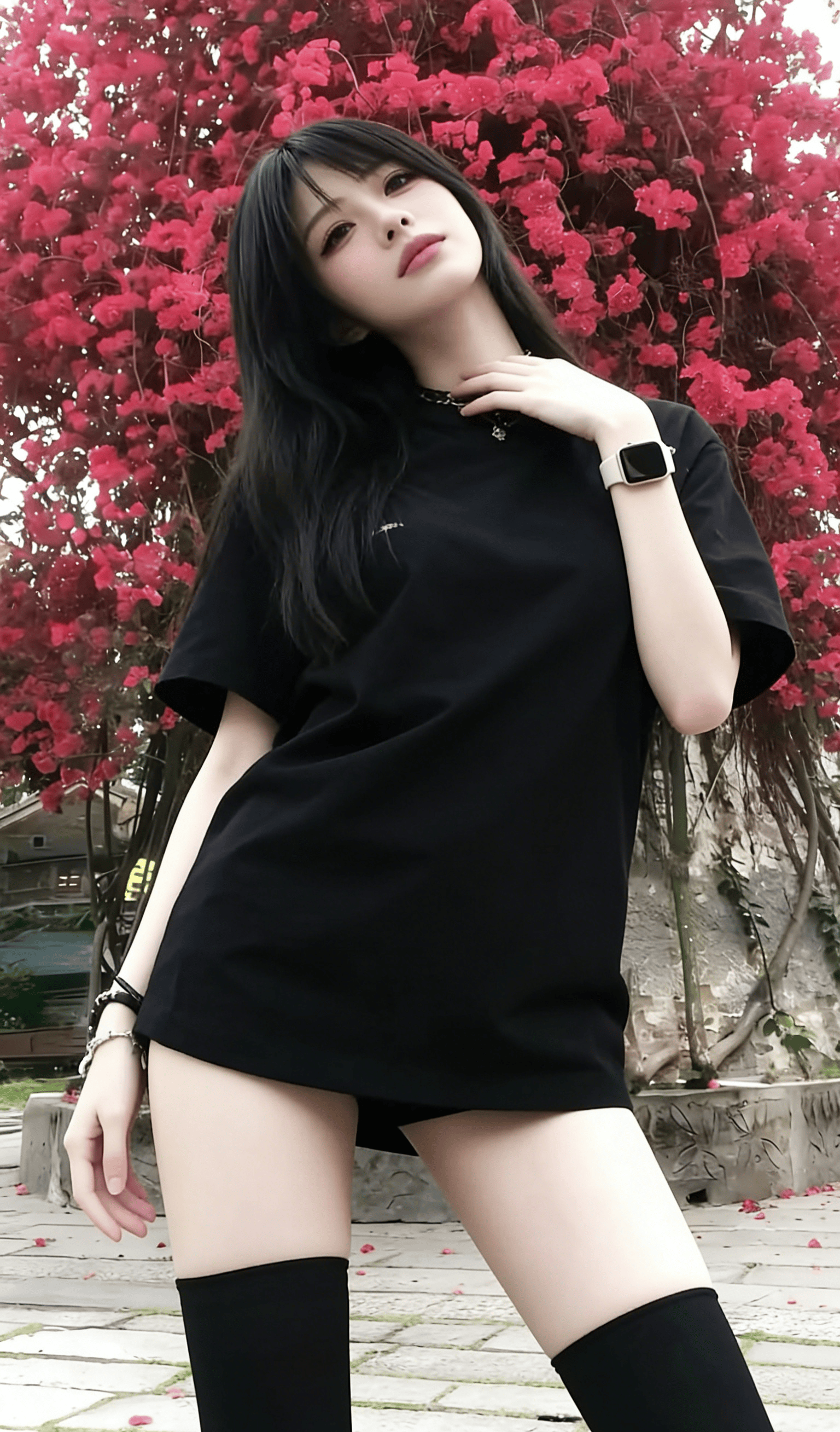 宽松的黑色 T 恤藏住了曼妙曲线,却偏偏用 “下衣失踪” 的小心机,把暧昧感拉满。手撑墙面的随性姿态,让腰臀的线条隐隐透出,不刻意、不张扬,没有半分讨好的媚俗,却处处都是让人忍不住心动的细节。