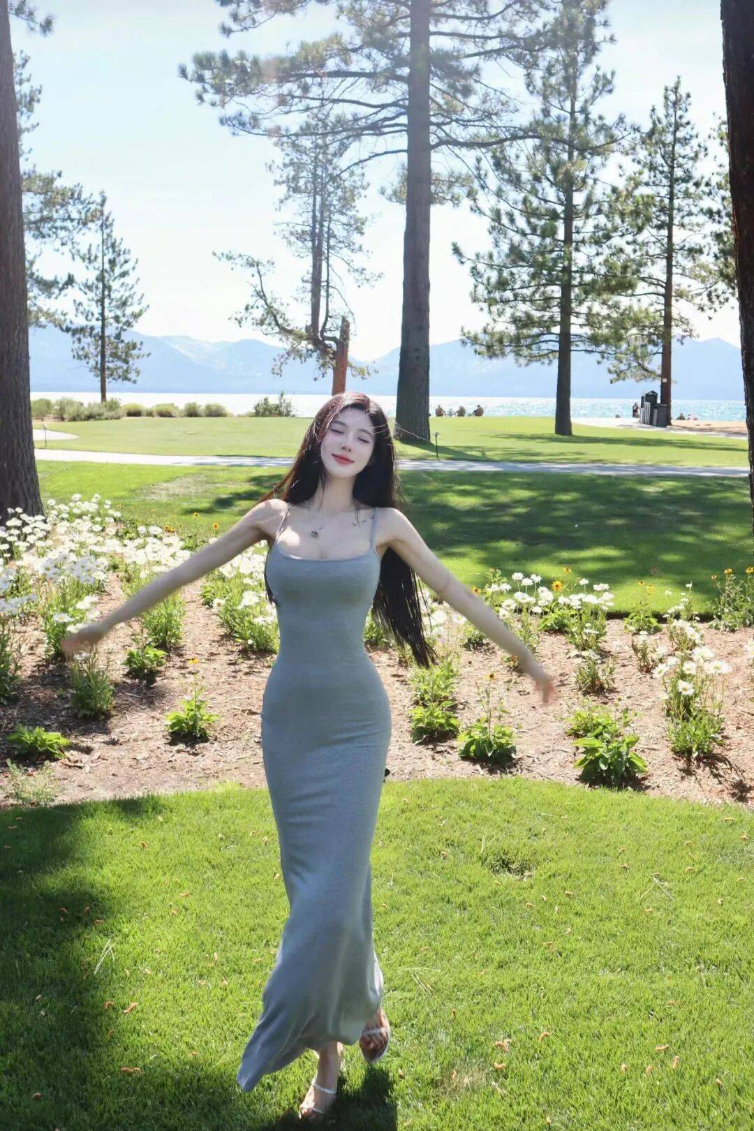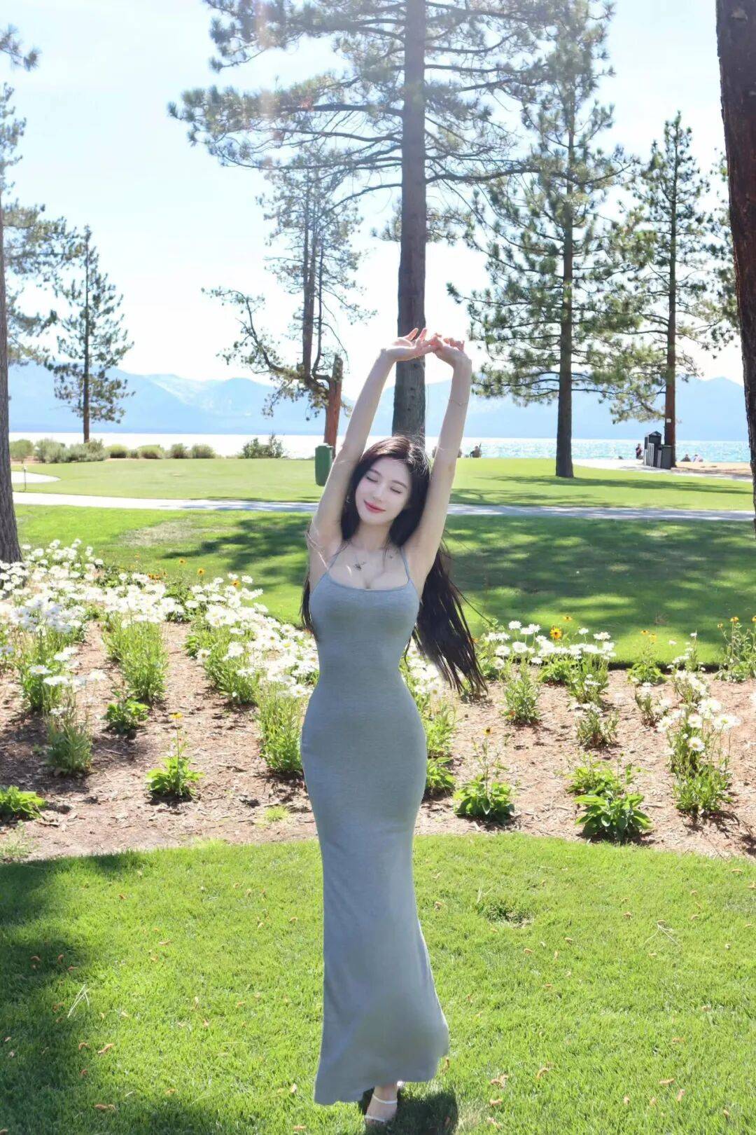 还是交叉站立,但双手自然张开,闭上眼睛笑一下,整个人会看起来很放松。长裙在这个动作下会有一点飘动感,画面更有层次,也能很好地突出腿部线条和腰身比例,照片会显得很有氛围。
