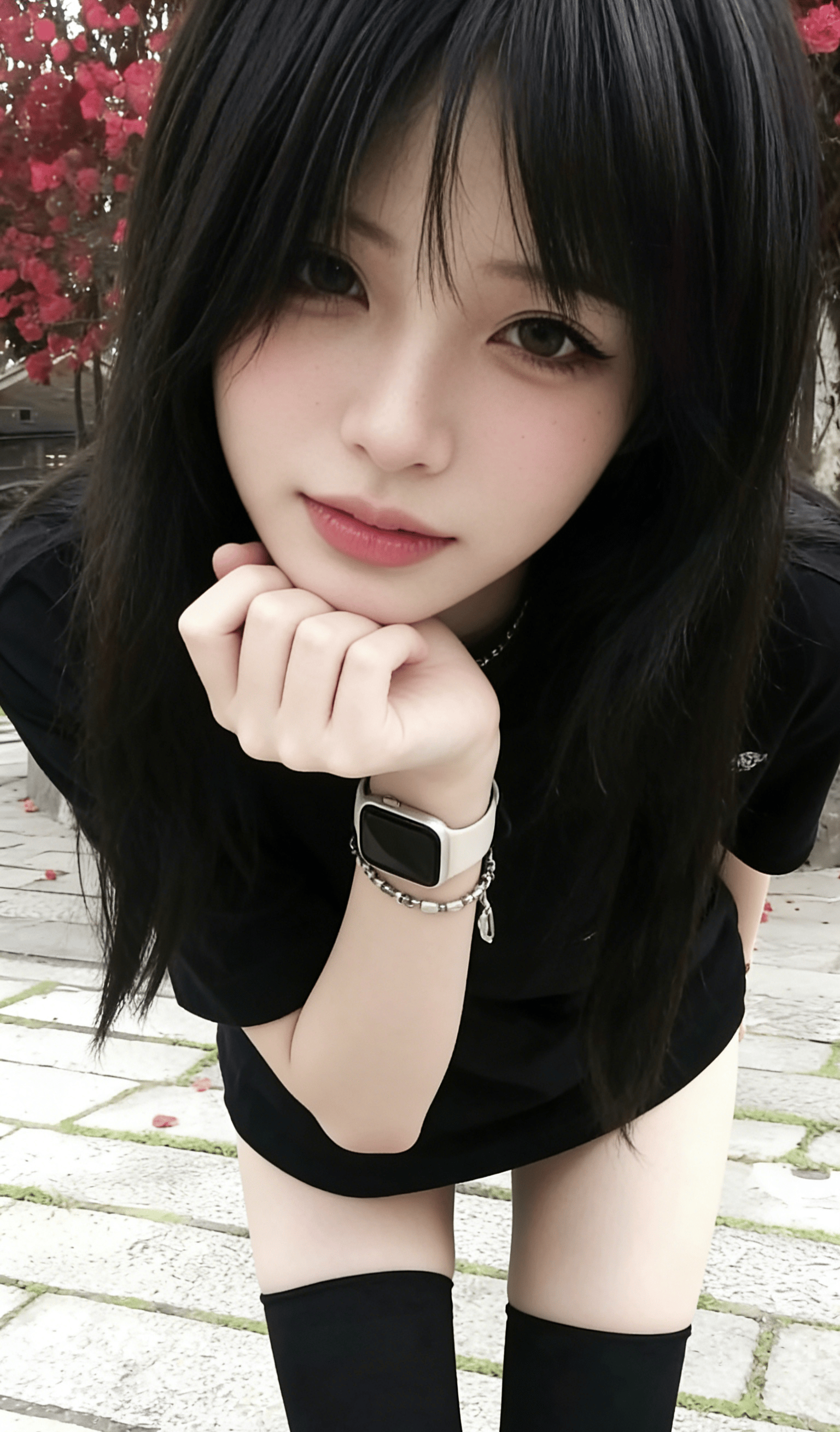 黑长直顺着肩头温柔垂落,软乎乎的空气刘海衬得眉眼愈发灵动,一双杏眼带着漫不经心的慵懒望过来,无辜感里藏着说不清的勾人气息,清甜与魅惑撞得恰到好处,只一眼就让人心跳直接漏拍。