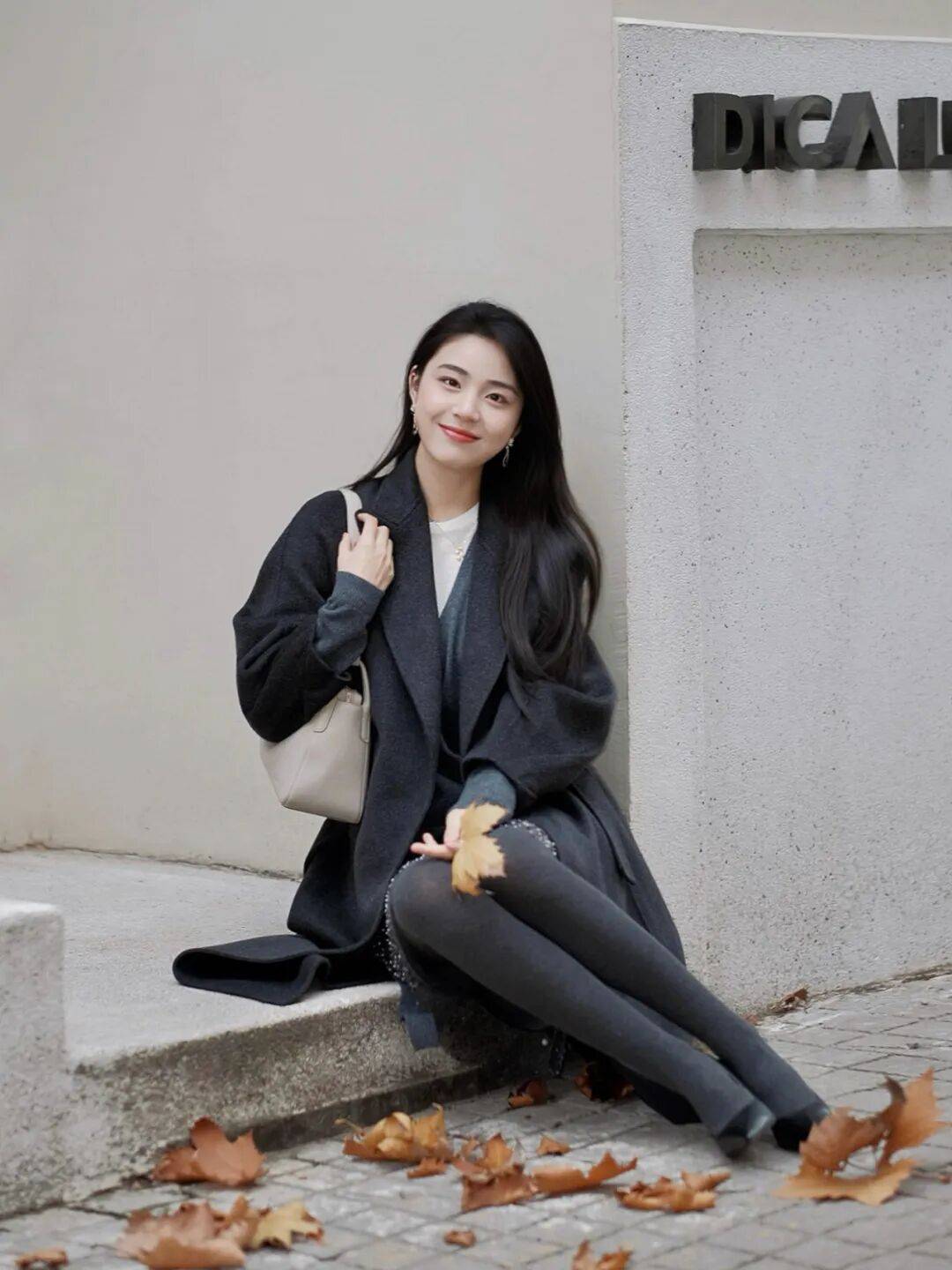 穿大衣拍照时侧坐在路边或台阶上很容易显得放松,身体微微侧着坐下,一只手自然拿着落叶,头轻轻回一点看镜头,整个人看起来不刻意,大衣的长度刚好垂下来,画面会很干净。