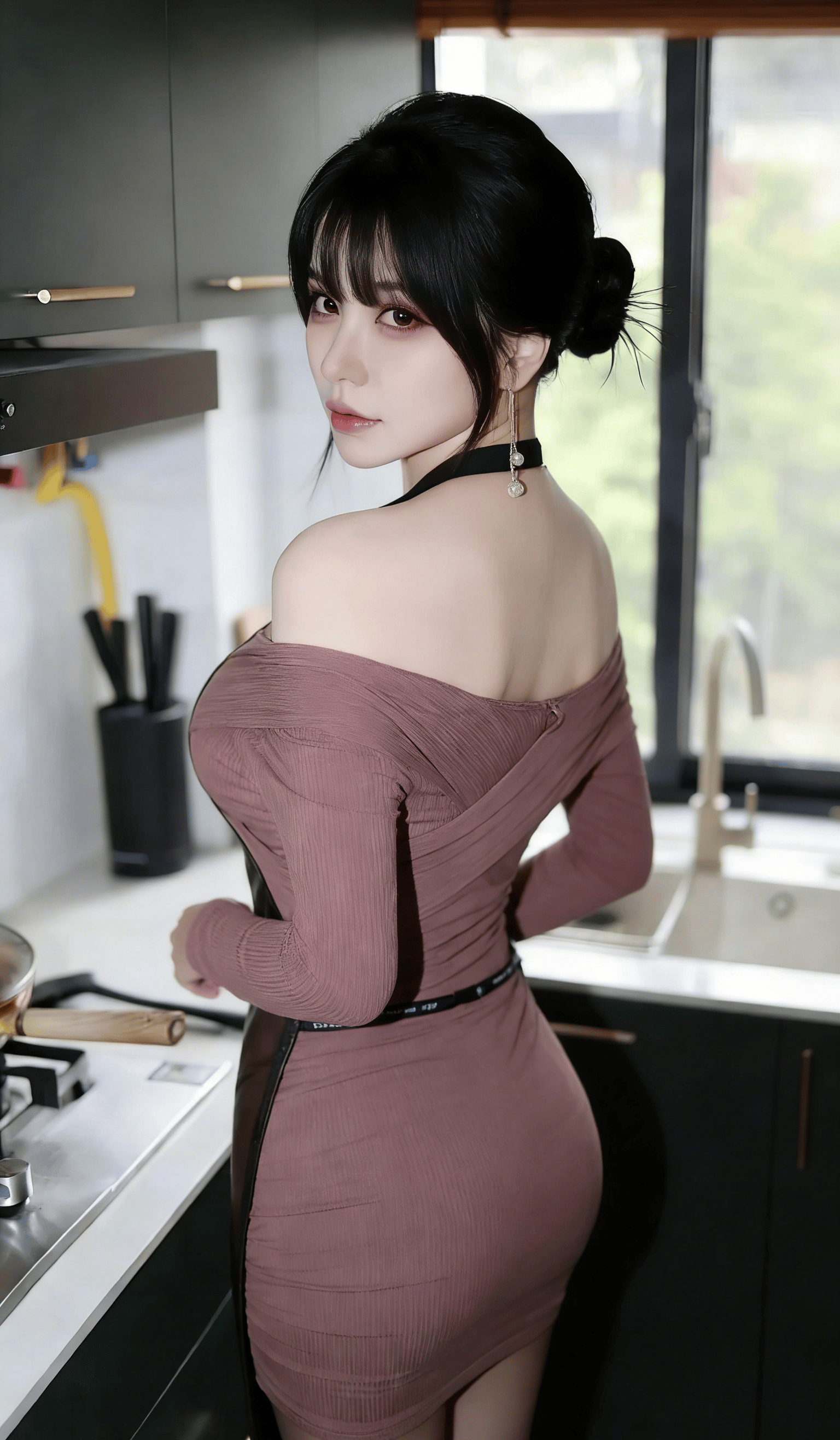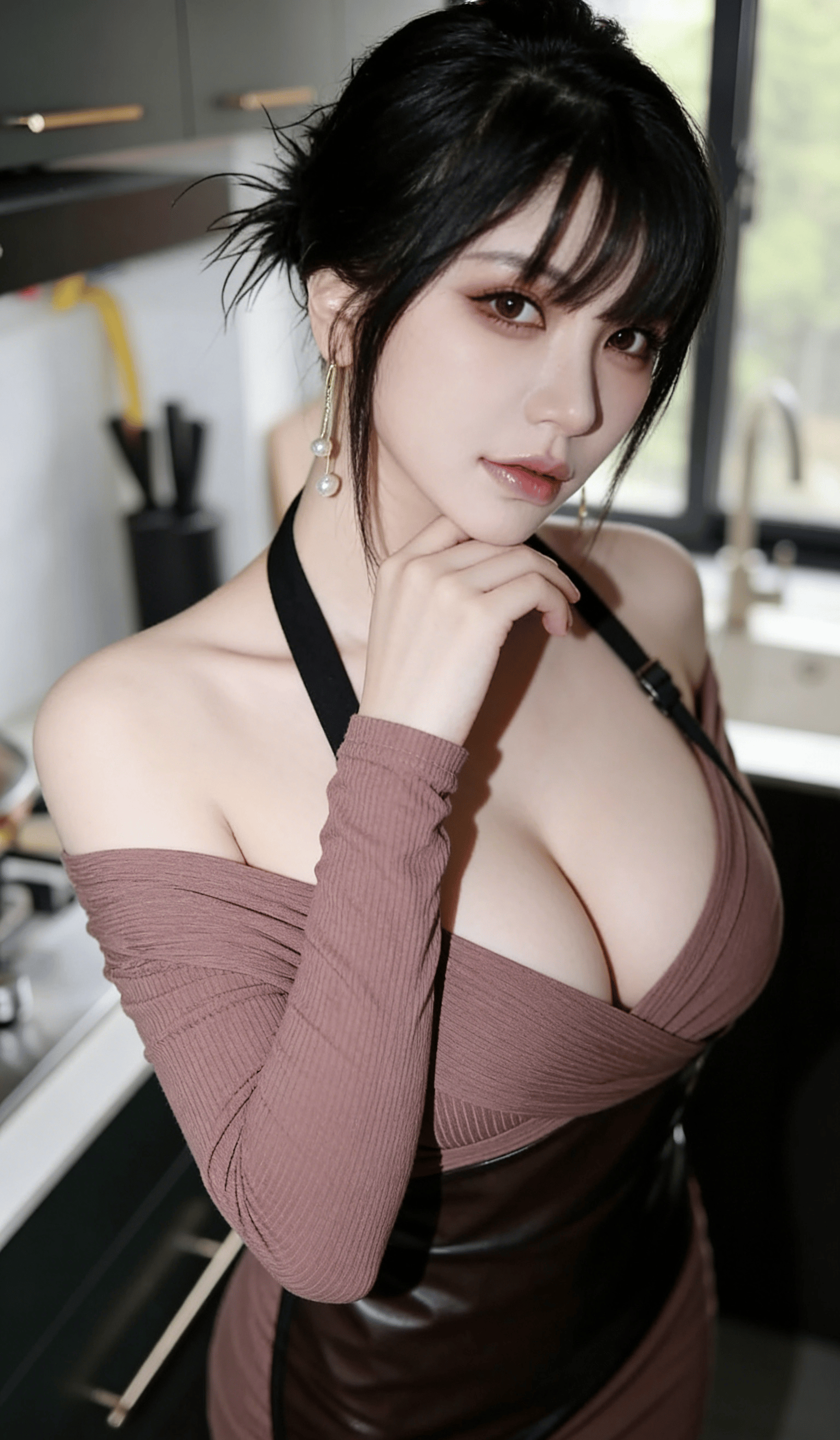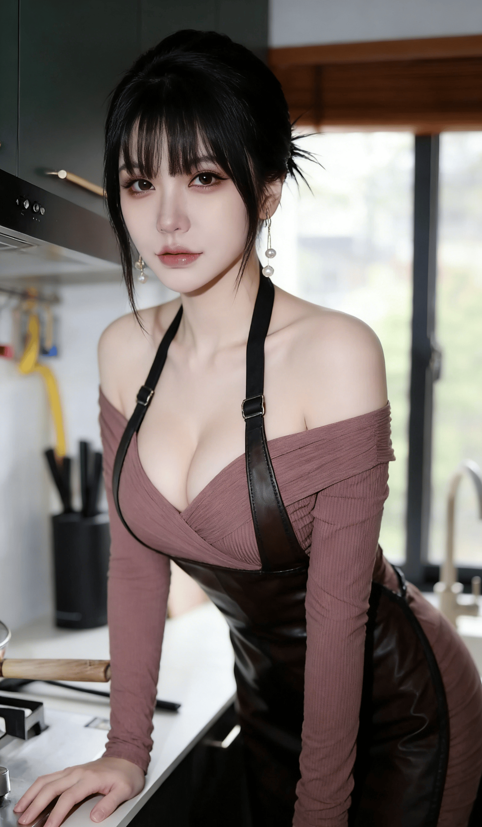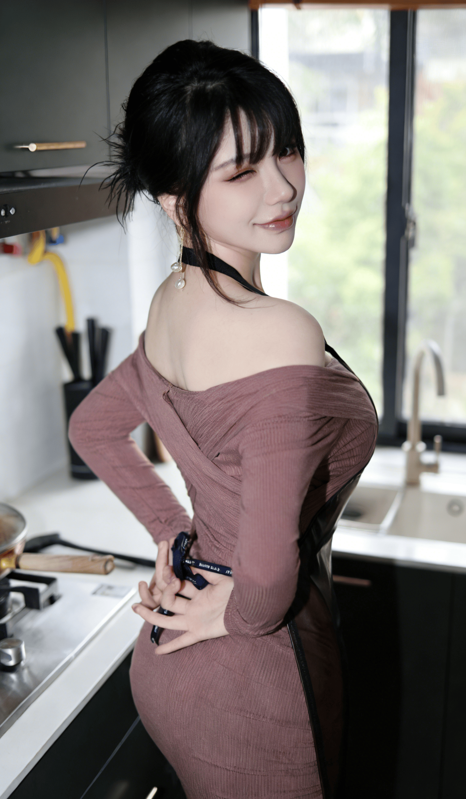 在充满生活气息的现代厨房里,这位女生以极具反差感的姿态,完美诠释了当代年轻人追捧的 “居家御姐风”,将烟火气与克制的性感巧妙融合,每一处细节都精准踩中当下审美。她身着粉色一字肩长袖上衣,修身剪裁贴合每一寸曲线,一字肩设计大胆露出流畅的肩颈线条与精致锁骨,在性感中带着一丝柔媚;外搭黑色皮质吊带围裙,亮面材质与针织上衣形成质感碰撞,吊带设计勾勒出饱满胸型,既注入了 “厨娘” 的角色感,又暗藏性感小心机,让整体造型在生活化中多了一丝冷艳。
