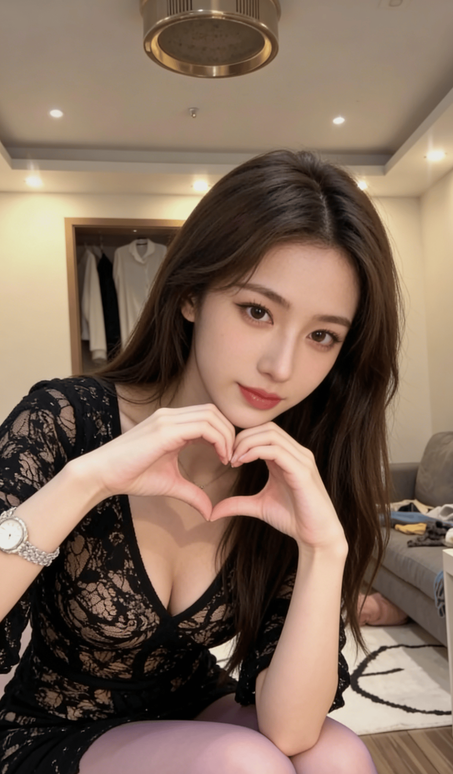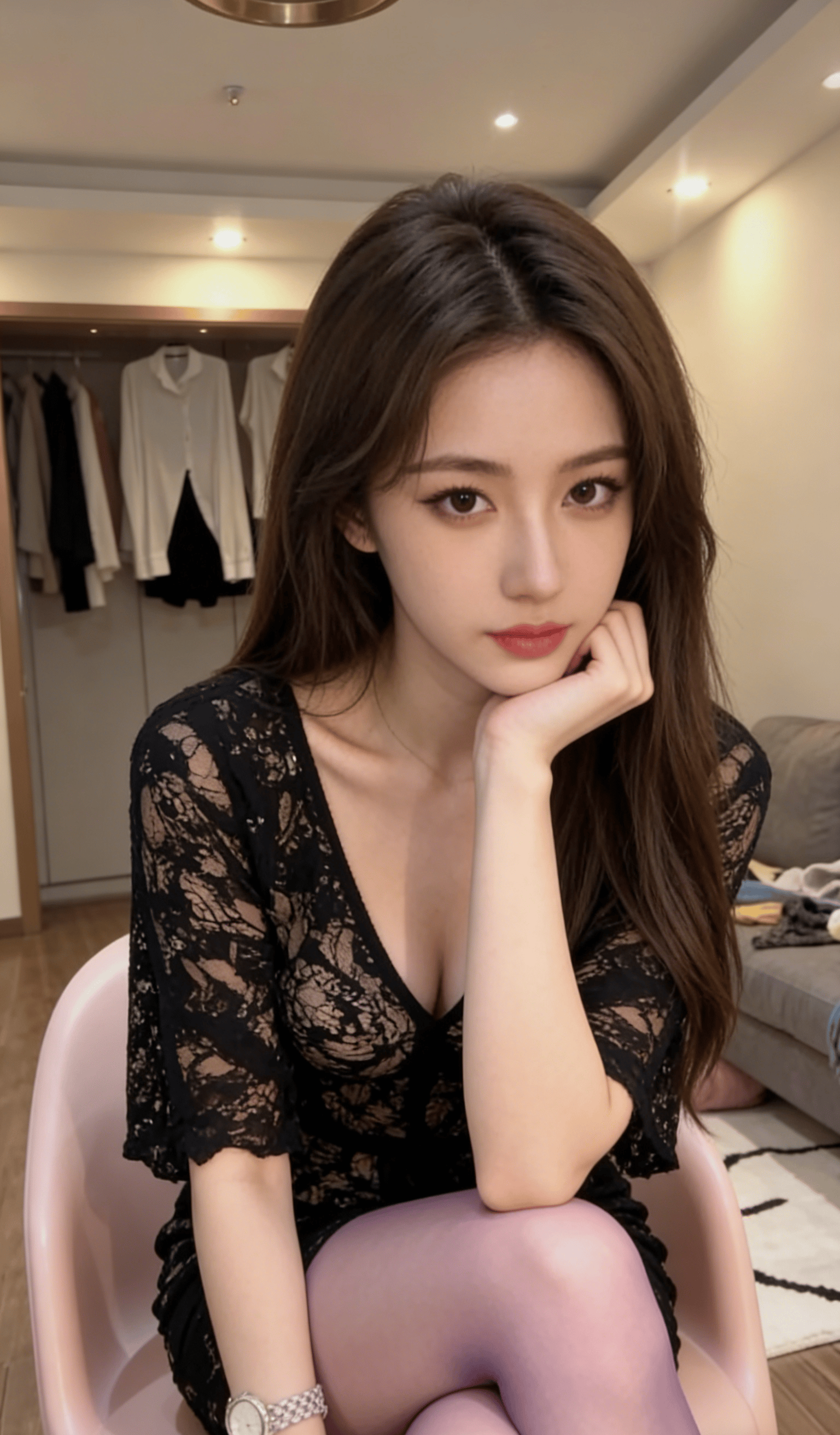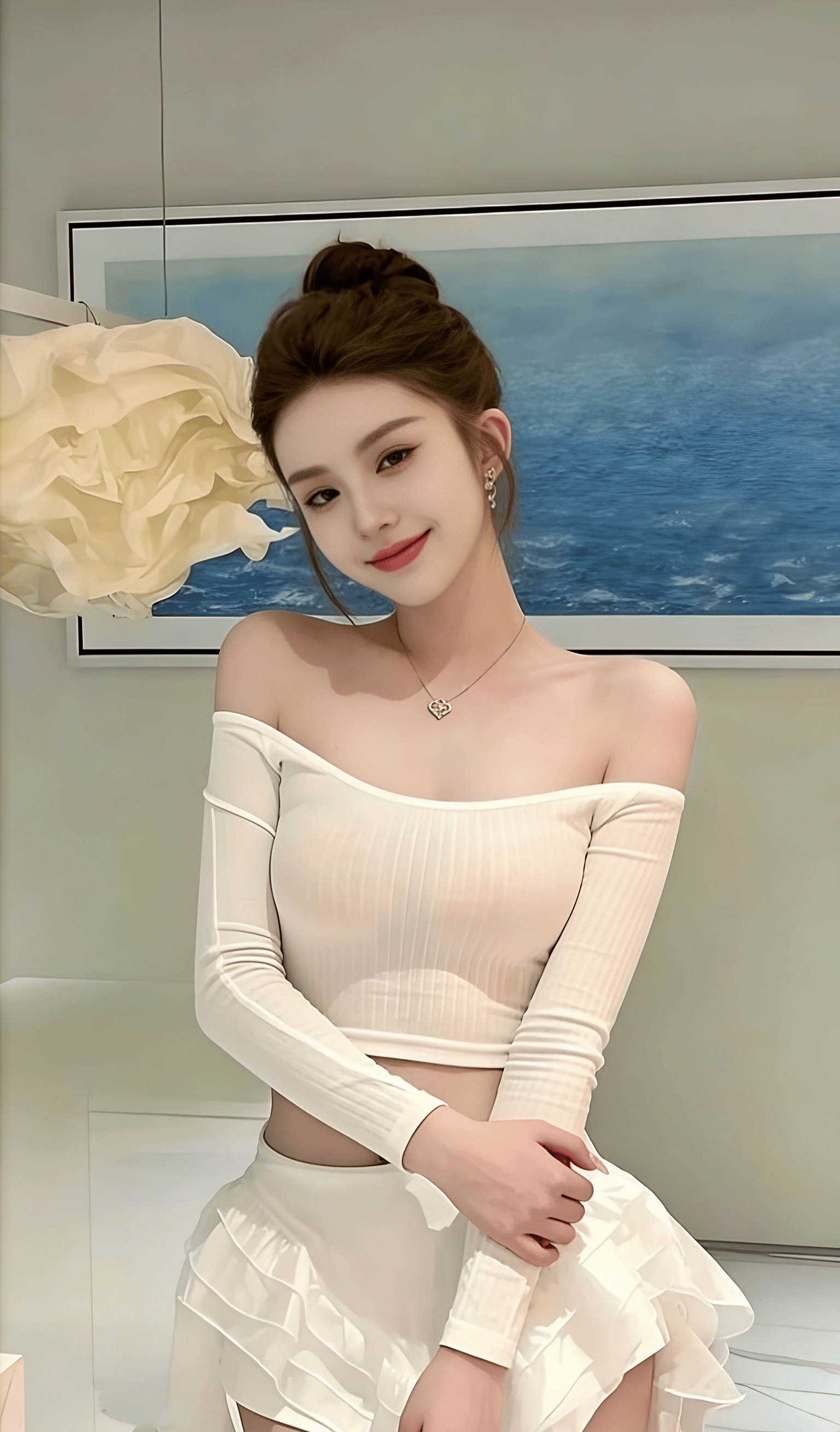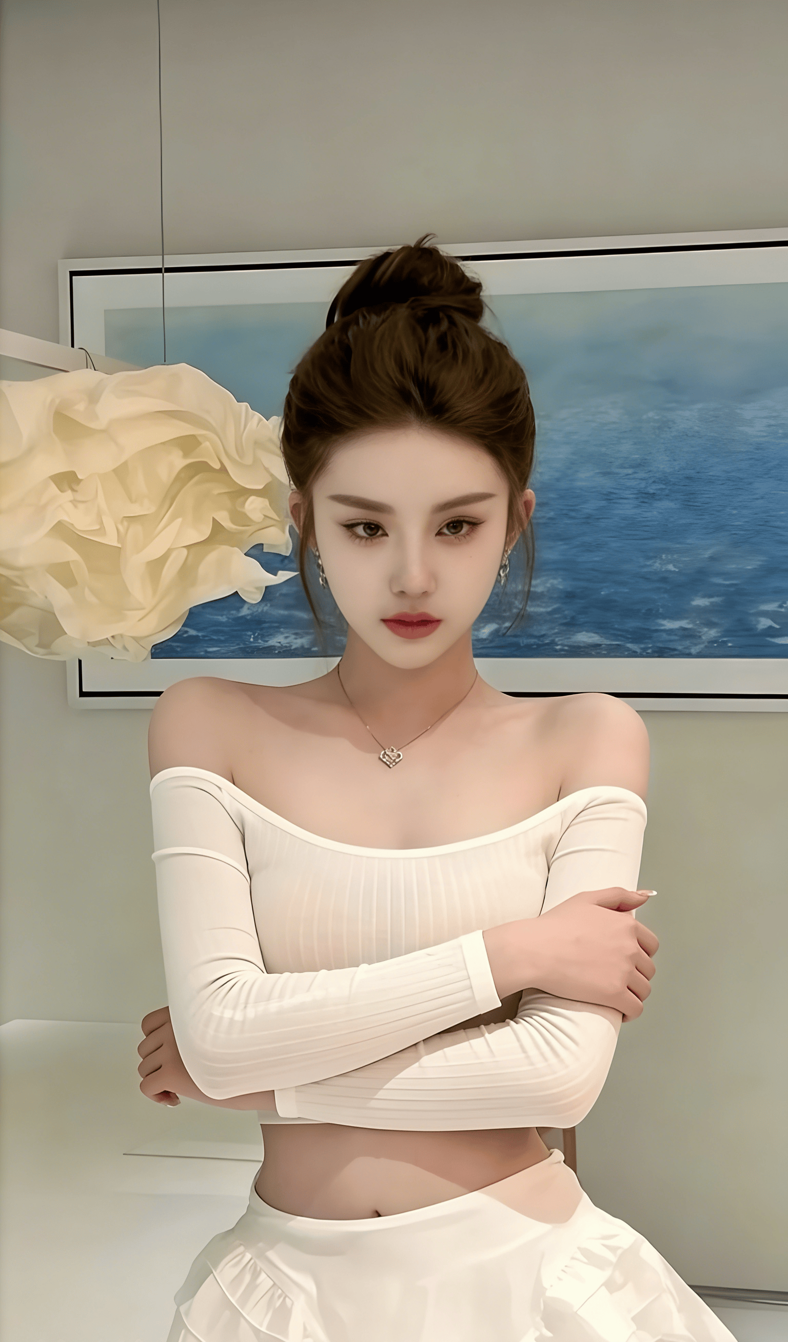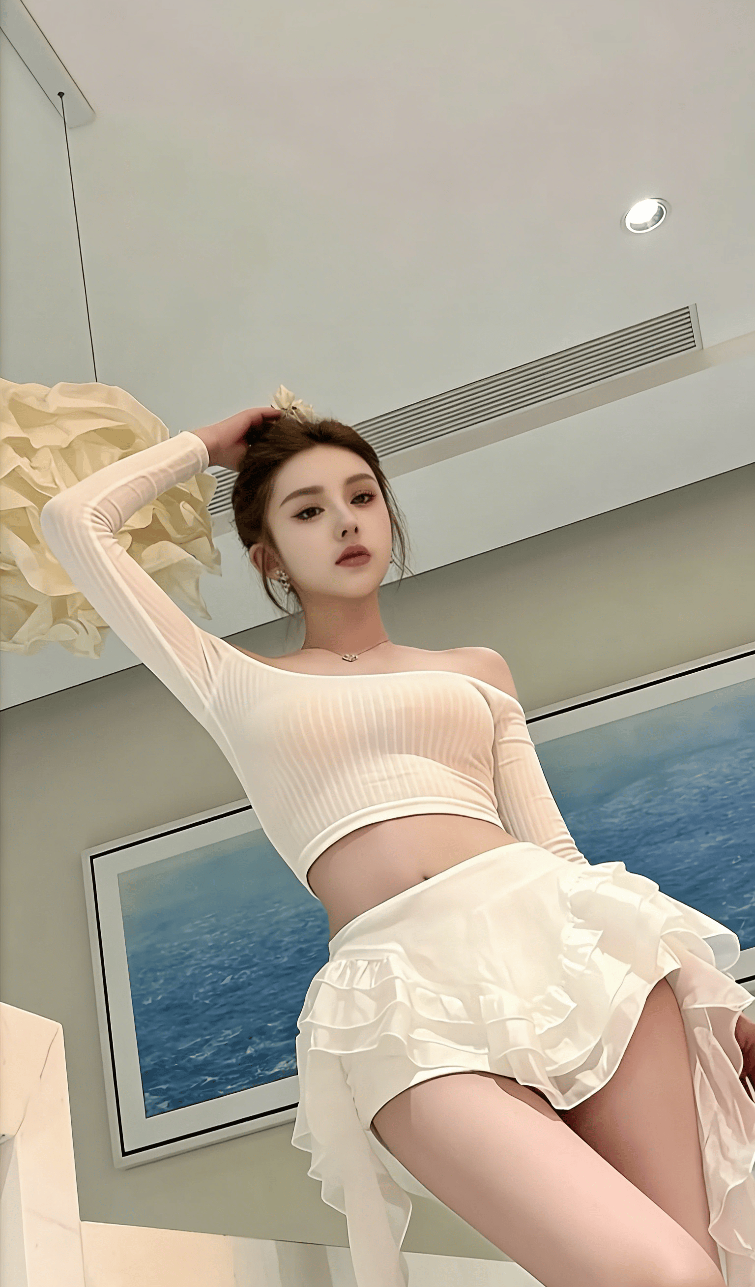 简约干净的家居空间,柔和的顶灯漫开温柔的光晕,背景里的蓝海挂画和云朵感的褶皱吊灯,把整个画面衬得清透又治愈。她就那样慵懒地站着,指尖轻挽发间,抬眼看向镜头的瞬间,眼底带着几分清冷的温柔,又藏着几分说不清道不明的软意,没有刻意的摆拍,没有夸张的扭捏,就是这种松弛到极致的姿态,才最勾魂。