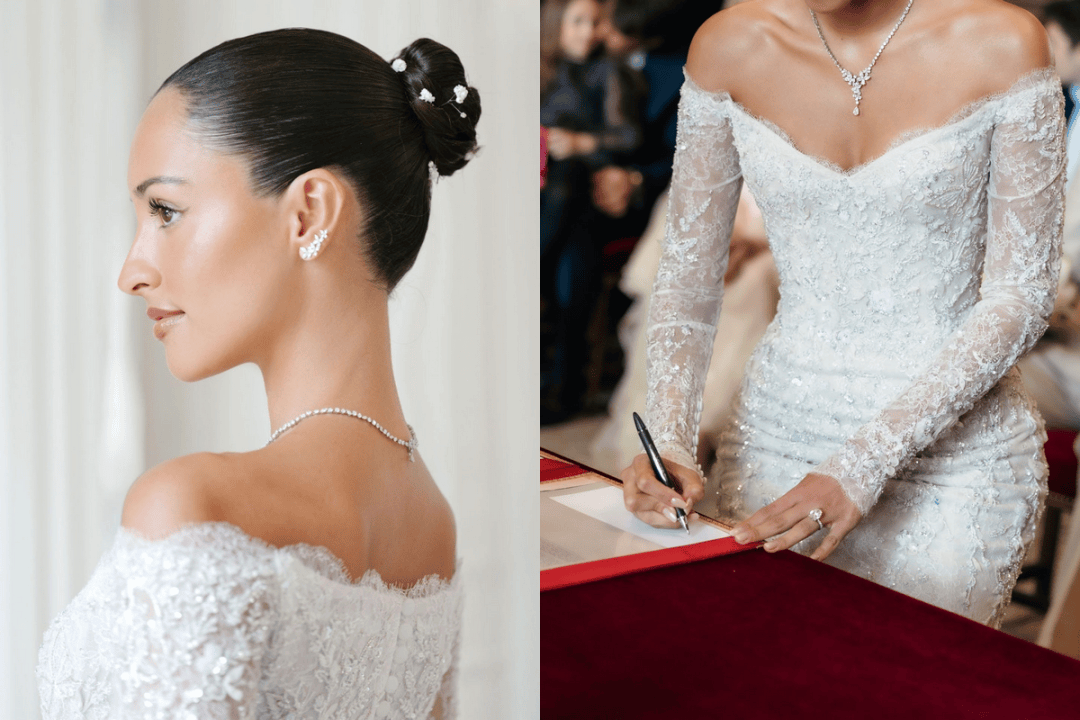 Alexandra当天佩戴品牌标志性的Classic Butterfly钻石项链,颈间层叠的钻石蝴蝶仿佛在光影间振翅欲飞,同时呼应婚纱上的蝴蝶,宛如仙子。