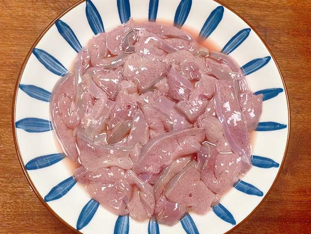 第二步:猪肝买回来先放清水里泡一会儿,中间换两次水,把血水泡出来。切片的时候注意,不要太薄也不要太厚。太薄了下锅容易碎,太厚了又不容易熟透,大概切成两个硬币那么厚就行。切的时候如果碰到有筋膜,顺手去掉,这样口感更嫩。