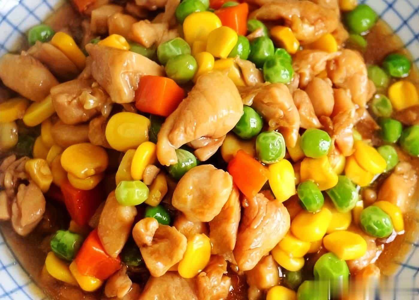 4. **五彩鸡丁** 风味特色:色彩缤纷,营养均衡。 食材用量:鸡胸肉200克,胡萝卜1根,玉米粒适量,豌豆适量,盐适量,生抽适量。 烹饪步骤:鸡胸肉切丁,用盐和生抽腌制10分钟。胡萝卜切丁,与玉米粒、豌豆焯水。锅中放油,翻炒鸡丁至变色,加入蔬菜丁翻炒均匀,加盐和生抽调味即可。
