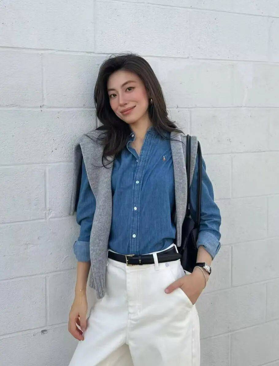 蓝色衬衫与白色阔腿裤的组合,是职场女性的“零失误”选择。浅蓝色衬衫自带清透感,微宽松的版型不挑身材,能藏住腰腹赘肉,肩部线条利落不紧绷,显得精神又随性。白色阔腿裤选高腰设计,裤管从胯部自然放宽,完美遮盖假胯宽、大腿粗等短板,梨形或苹果形身材都能驾驭。将衬衫敞开穿,露出内搭的小面积肌肤,增加呼吸感,脚上穿一双浅口单鞋,露出脚背延伸腿线,整体造型清爽又高级,适合上班或商务场合。