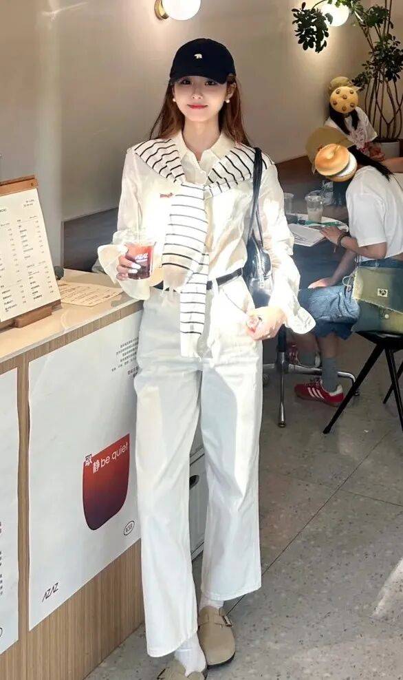想要让白色阔腿裤的搭配更有细节,配饰是关键。比如用一条细腰带勾勒腰线,增加层次感;戴一副墨镜或一顶帽子,让基础款的条纹T恤+白色阔腿裤变潮流;选一个撞色包包或一双有设计感的鞋子,呼应整体颜色,比如白色阔腿裤+白色运动鞋+彩色包包,休闲又时髦。