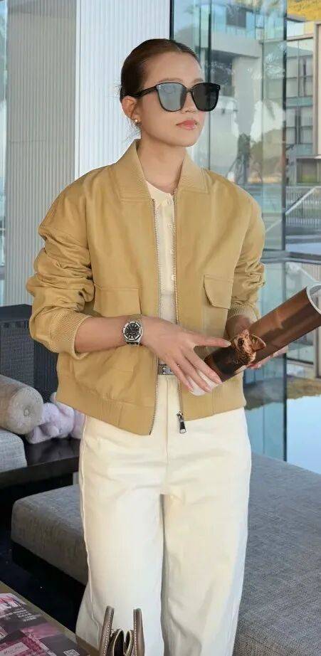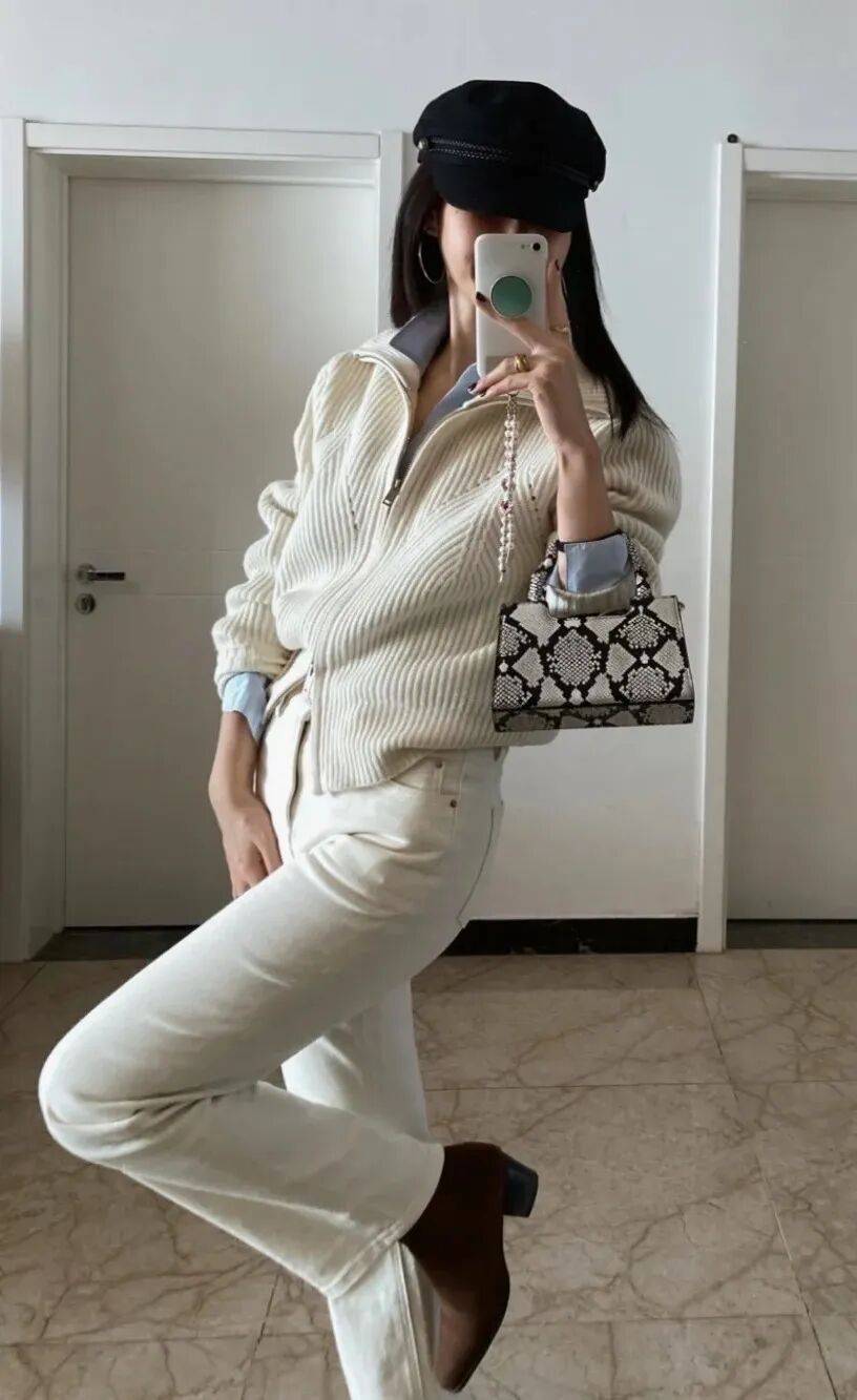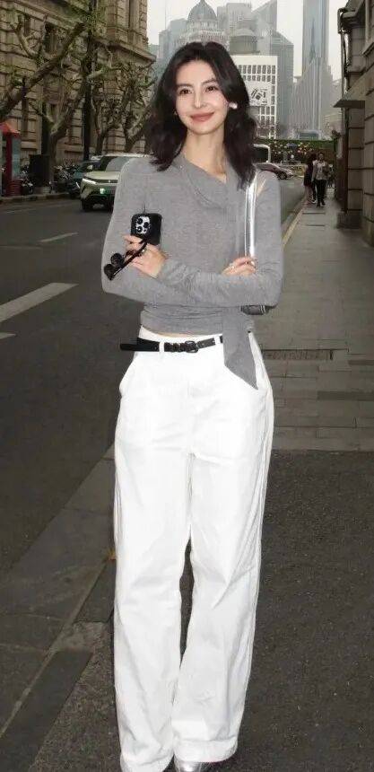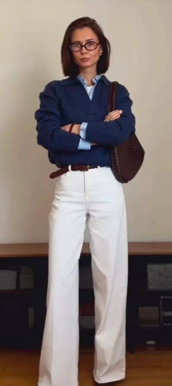 对于小个子或想显高的女生,短上衣与白色阔腿裤的组合是“神器”。选短款针织开衫、短皮夹克或短牛仔外套,长度刚好到腰际,与白色阔腿裤的高腰设计形成“上短下长”的比例,瞬间拉长腿部线条。内搭可以选修身的T恤或衬衫,将下摆塞进裤腰,进一步突出腰线。这种搭配不仅显高,还能让整体造型更利落,适合各种日常场景。