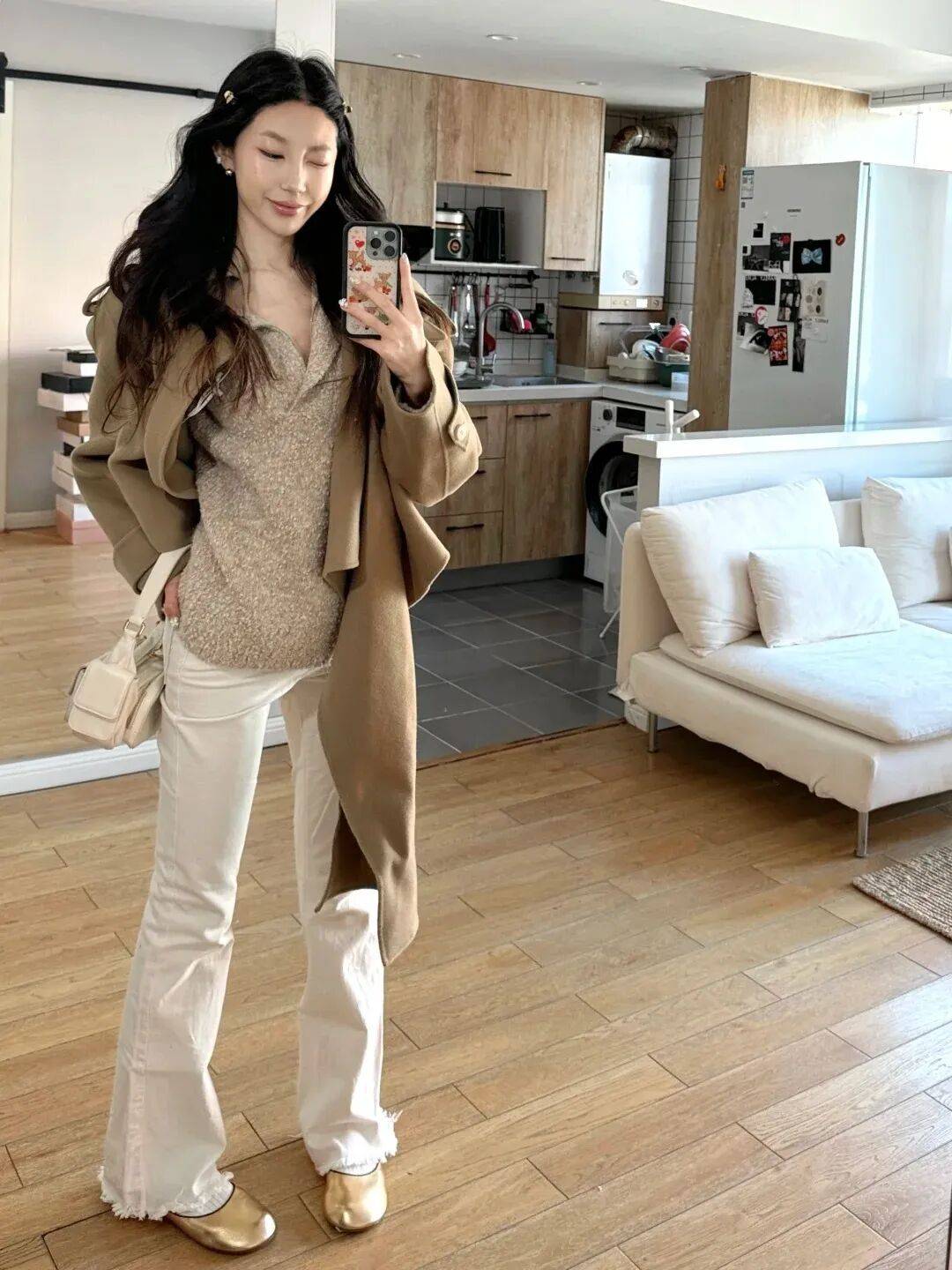一、温柔知性风:针织开衫+白色阔腿裤