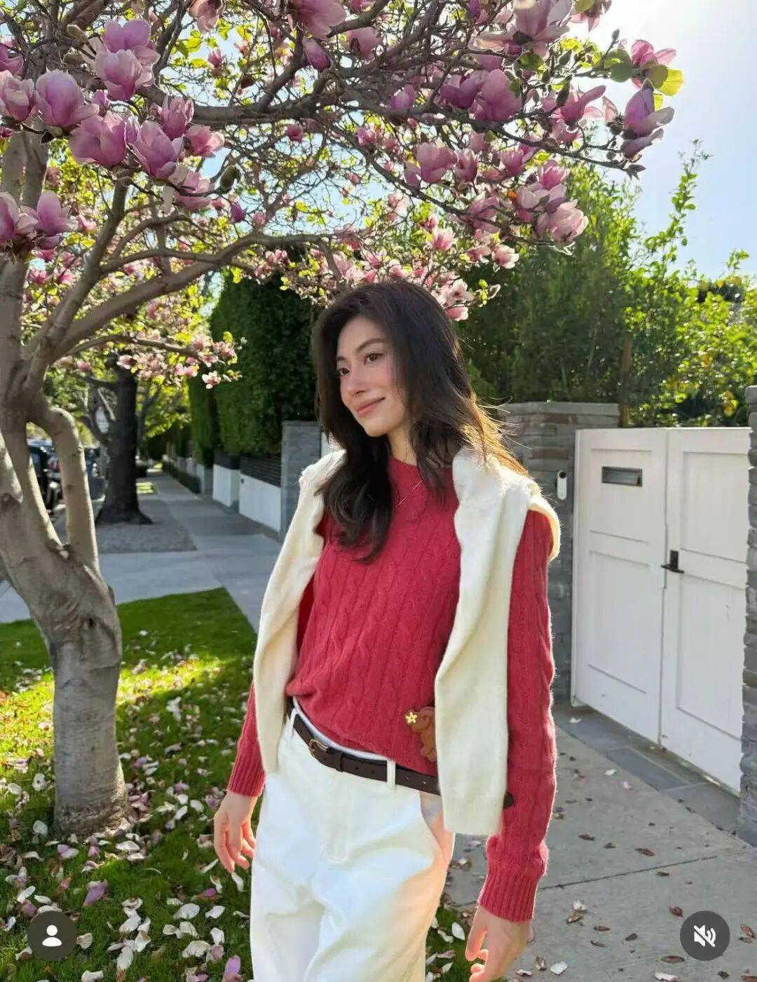 春天的针织开衫自带柔软属性,与白色阔腿裤的清爽结合,刚好营造出温柔又高级的气质。选择米白、浅粉或淡蓝等低饱和度颜色的针织开衫,版型微宽松但不拖沓,内搭简单的T恤或衬衫,将下摆塞进阔腿裤的高腰处,瞬间拉高腰线,优化身材比例。这种搭配既适合通勤的干练需求,也能满足休闲约会的温柔感,脚上踩一双平底德训鞋或浅口单鞋,舒适又时髦。