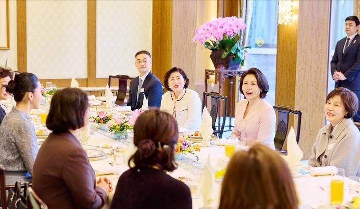 2026年1月5日,北京,韩国第一夫人金惠景在韩国驻华大使馆邀请长期致力于韩中友好交流的中国女性代表出席午餐会,亲手准备年糕饺子汤热情款待。