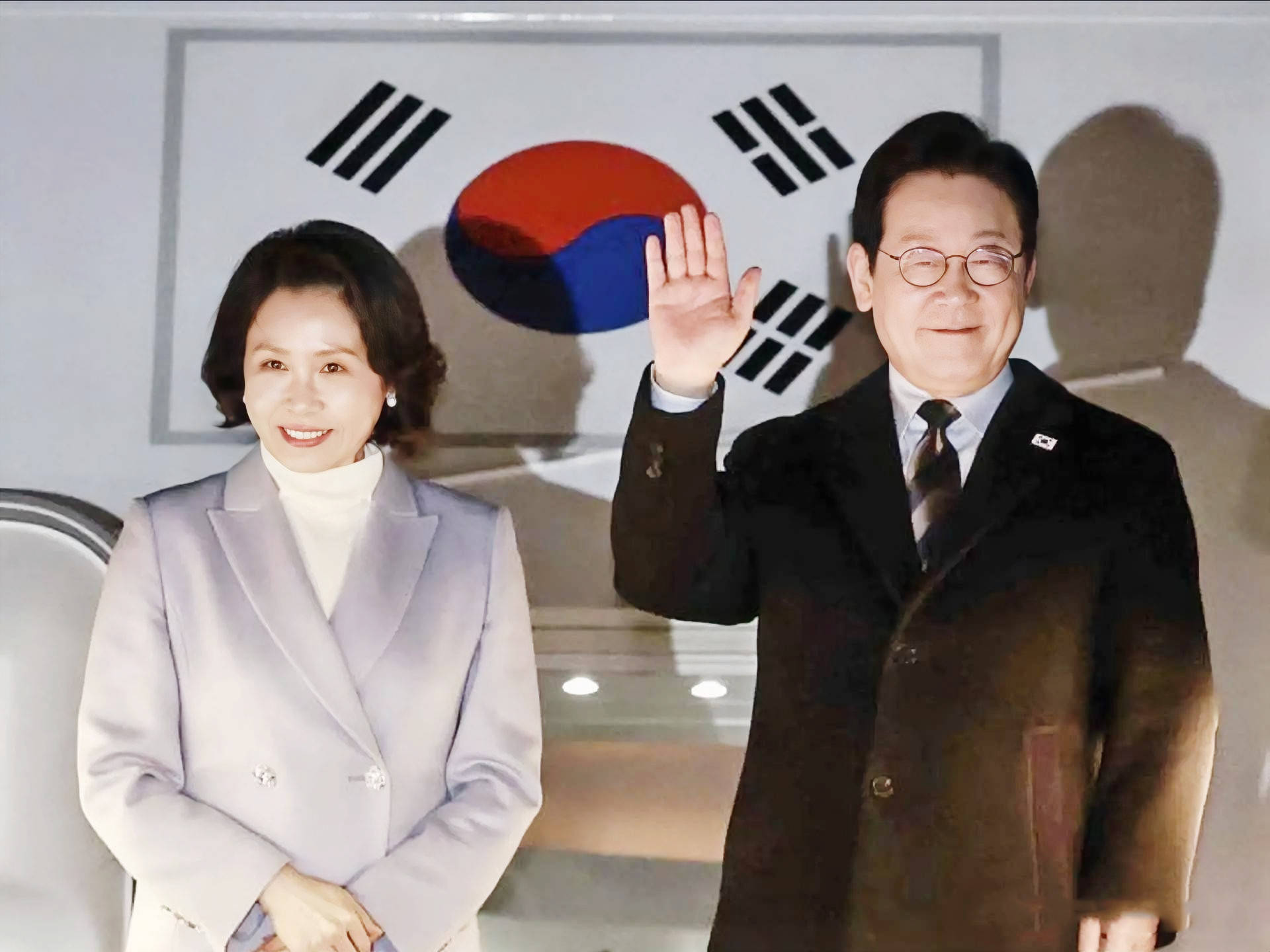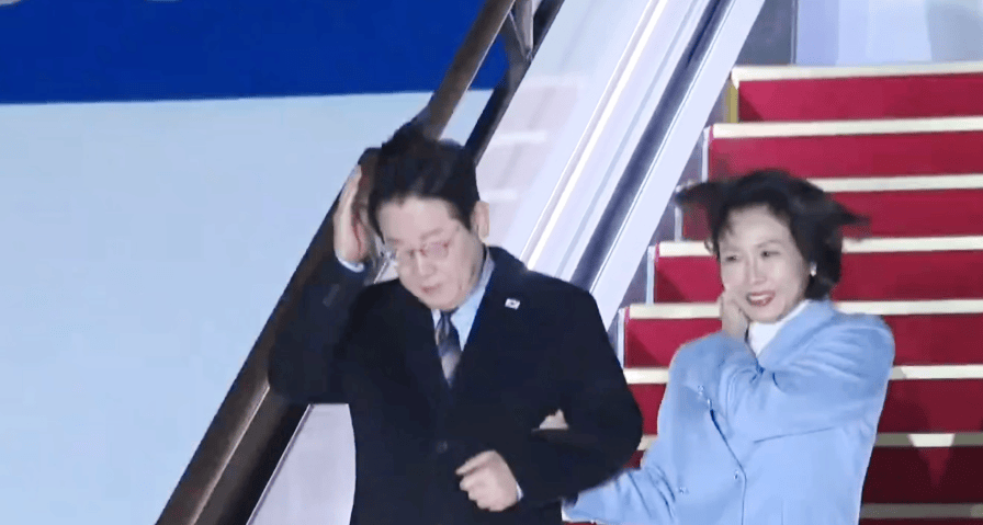 2026年1月4日,北京,韩国总统李在明和夫人金惠景抵达北京首都机场,对中国进行国事访问。