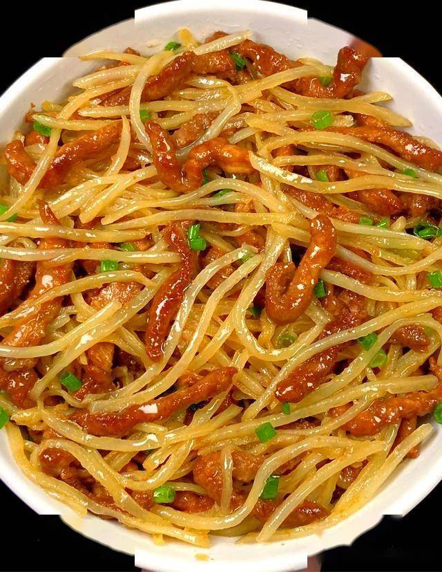 7. 关火出锅,土豆丝清脆,肉丝鲜嫩,下饭又解腻。