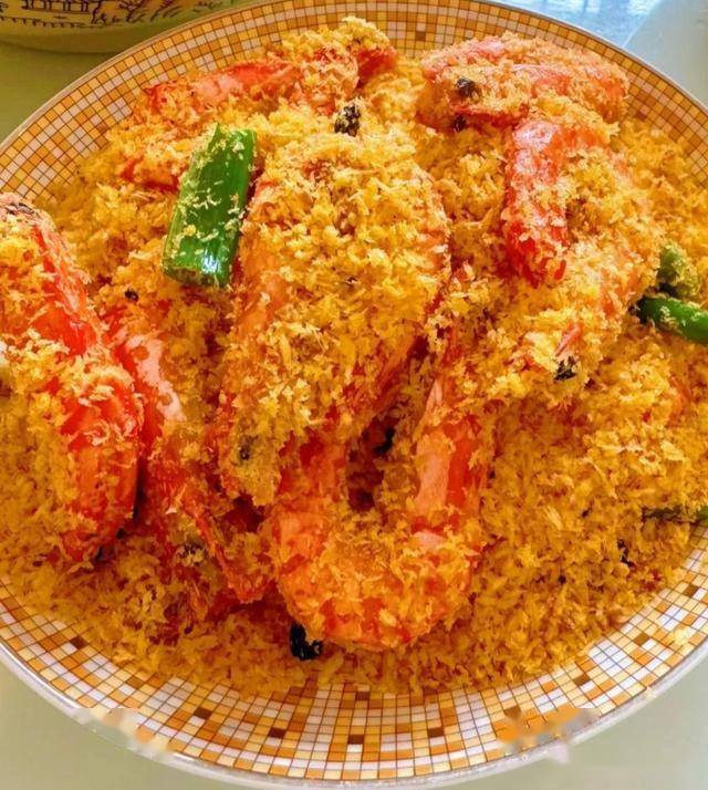 5. 混合出锅:最后,倒入炸好的大虾,快速翻炒,让每一只虾都均匀地裹上金黄的面包糠和蒜末,就可以出锅啦!满屋子的蒜香和虾香,真是太诱人了!