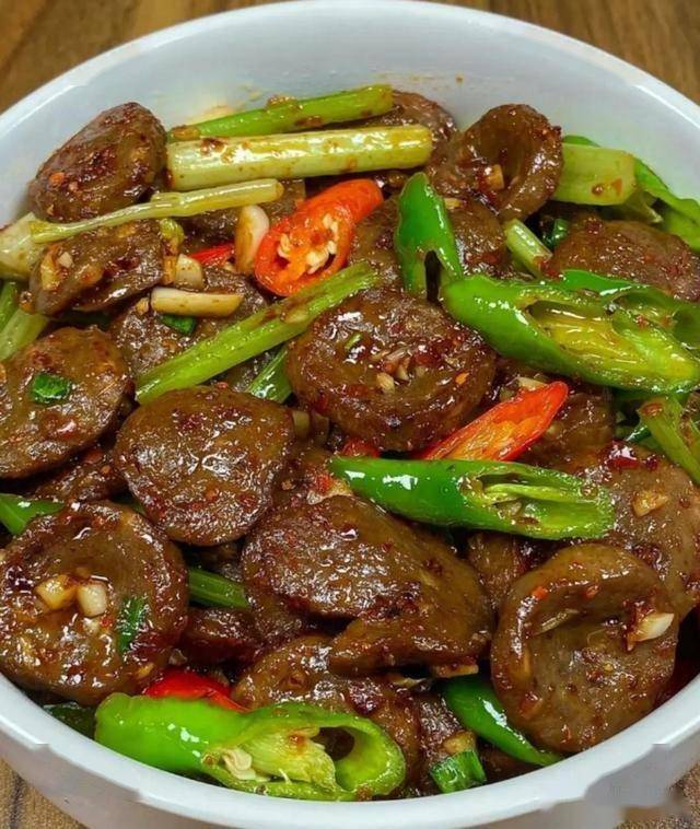 6. 放入青椒块和红椒块继续翻炒,炒至断生。