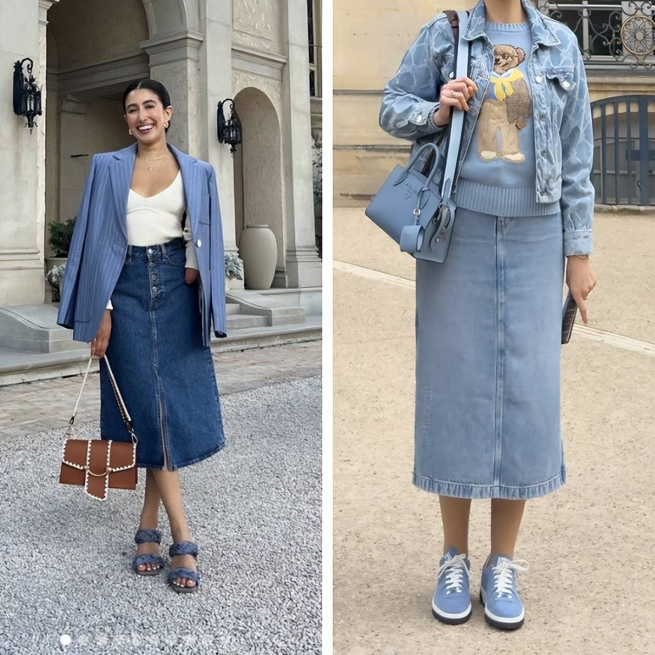 牛仔衬衫与黑色包臀裙的混搭恰好平衡了随性与精致,蓝白花纹的复古感与黑色的沉稳相互映衬,印花细节则为整体注入亮点,却不显得夸张。短款上衣与高腰裙装的搭配拉长下半身比例,露出的腰线与腿部线条尽显身形优势,没有刻意堆砌的元素,仅靠材质与色彩的碰撞就打造出日常又不廉价的效果,适合各种日常场景。站立时的舒展姿态传递出自信从容,行走时的松弛律动则让混搭风格更具张力。