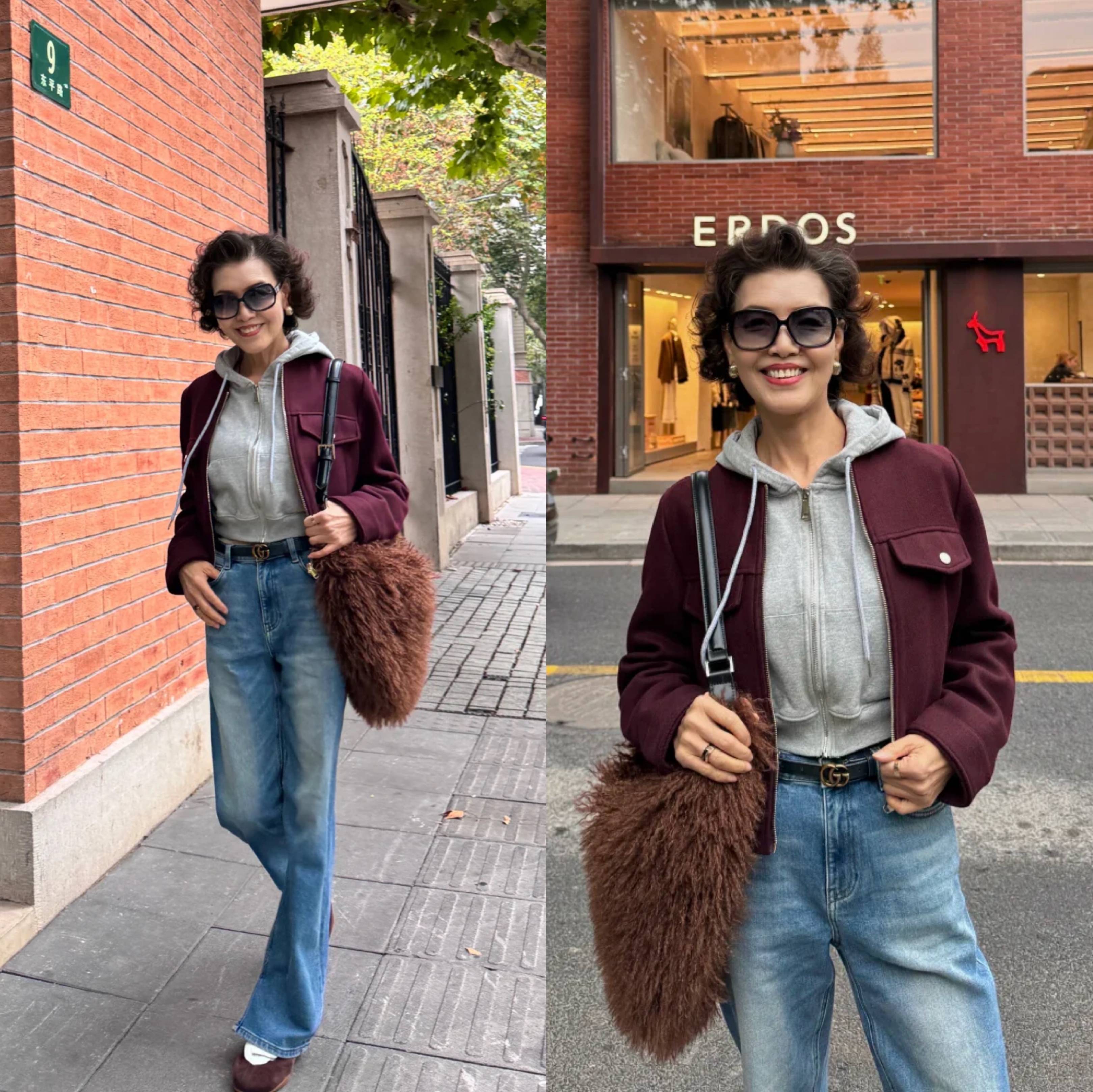 大龄女性想穿出个性减龄感,不妨试试这组搭配。暗紫色超短款外套吸睛亮眼,内搭灰色超短连帽卫衣,层次丰富又青春。下半身高腰牛仔微喇裤拉长腿部线条,修饰腿型。整体上短下长,凸显比例,轻松打造时髦又活力的街头风格。