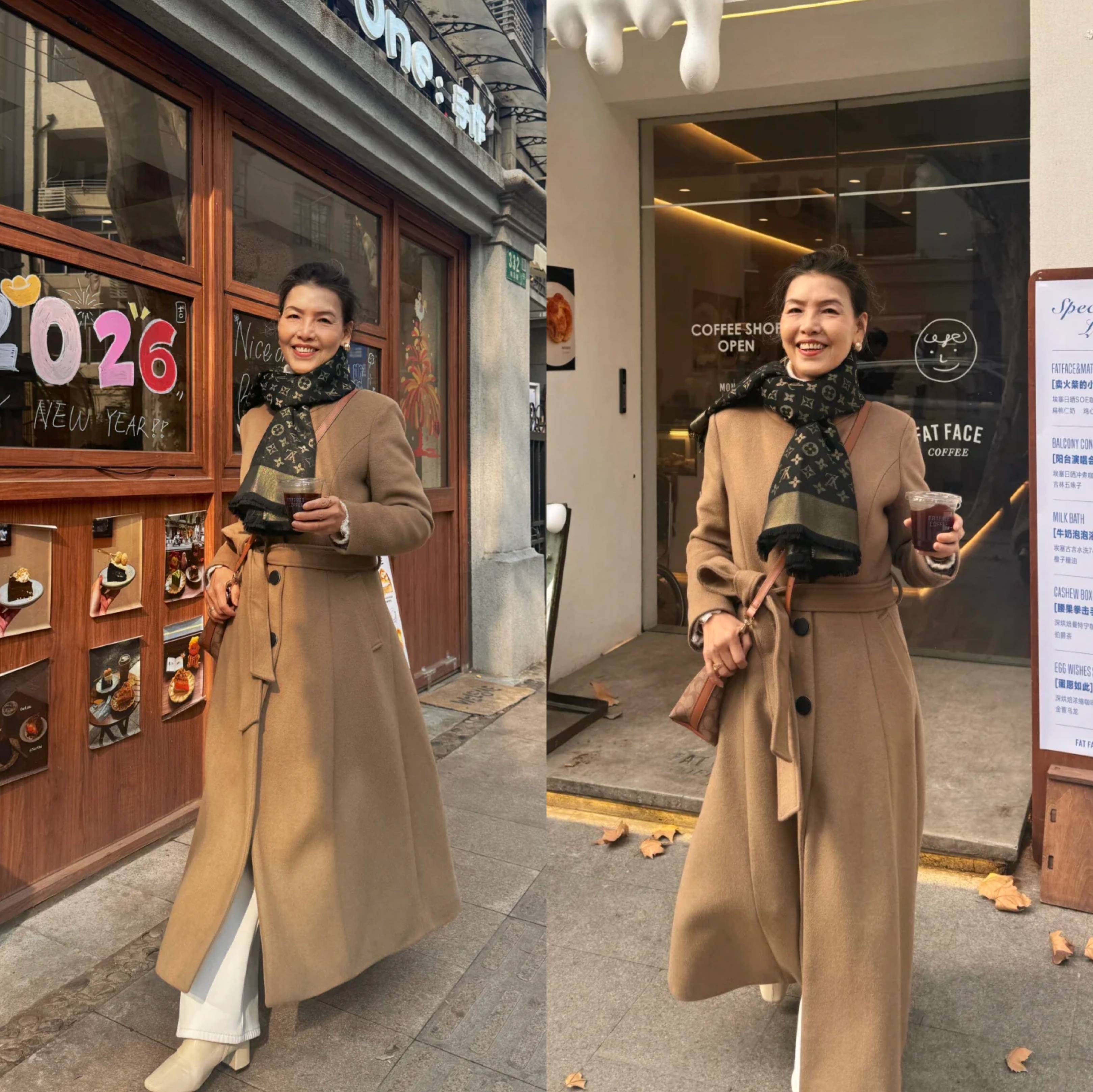 驼色长款大衣自带高级感,系上腰带凸显腰线,优化比例更显利落,白色直筒西裤清爽提亮,与卡其色粗跟短靴顺色延伸腿长;黑色老花围巾点睛,打破沉闷又添复古韵味。整体松弛有度,兼顾温度与风度,轻松穿出大龄女性的优雅从容。
