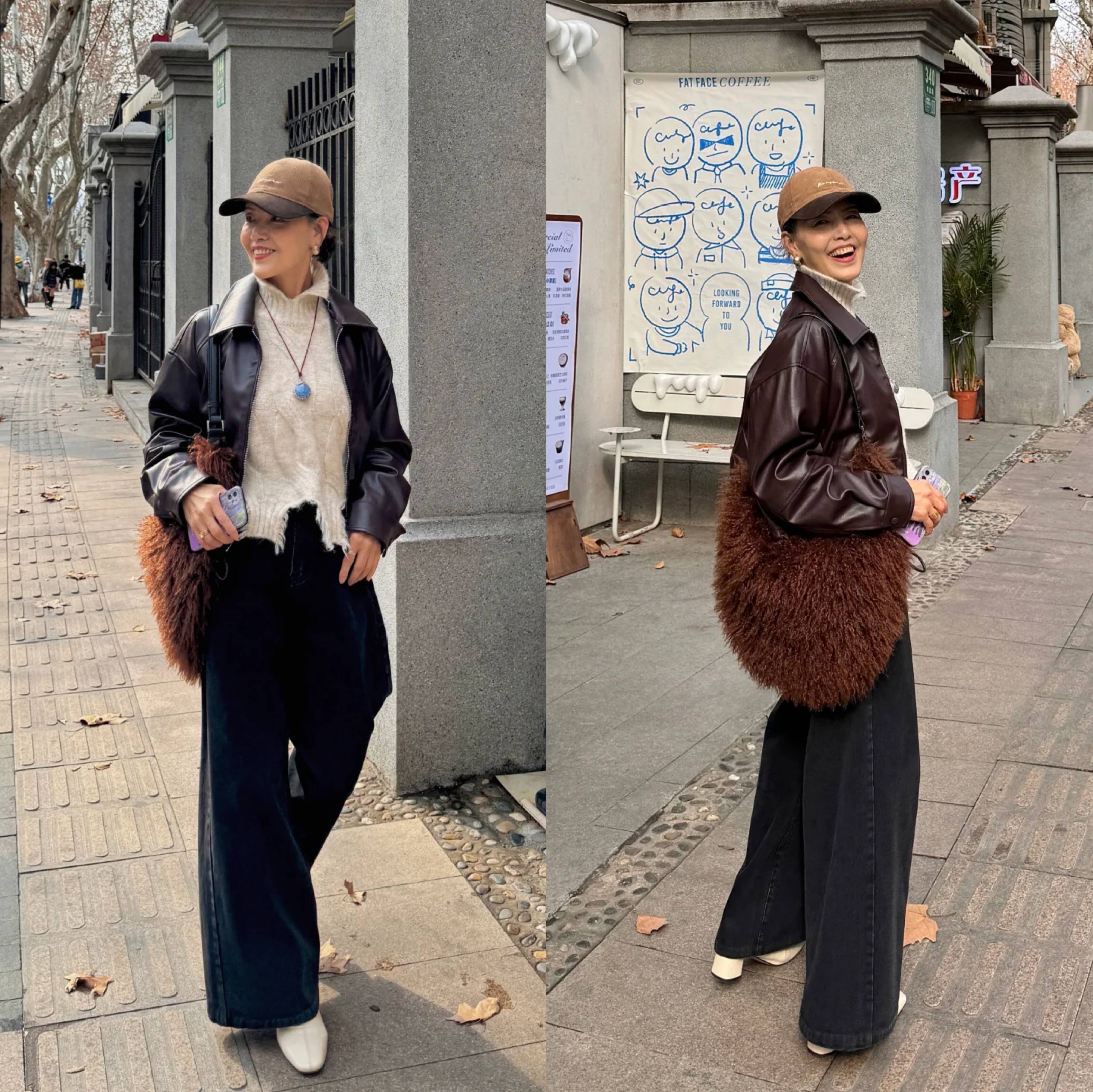短款皮夹克自带酷感,修饰身形更显高挑,大龄女性可以打破常规,这样穿,利落又显气质!内搭米色毛衣温柔提亮,与米色粗跟鞋上下呼应,细节感拉满。灰黑色牛仔阔腿裤藏肉显瘦,整体配色简约高级,轻松打造松弛有度的日常通勤风。