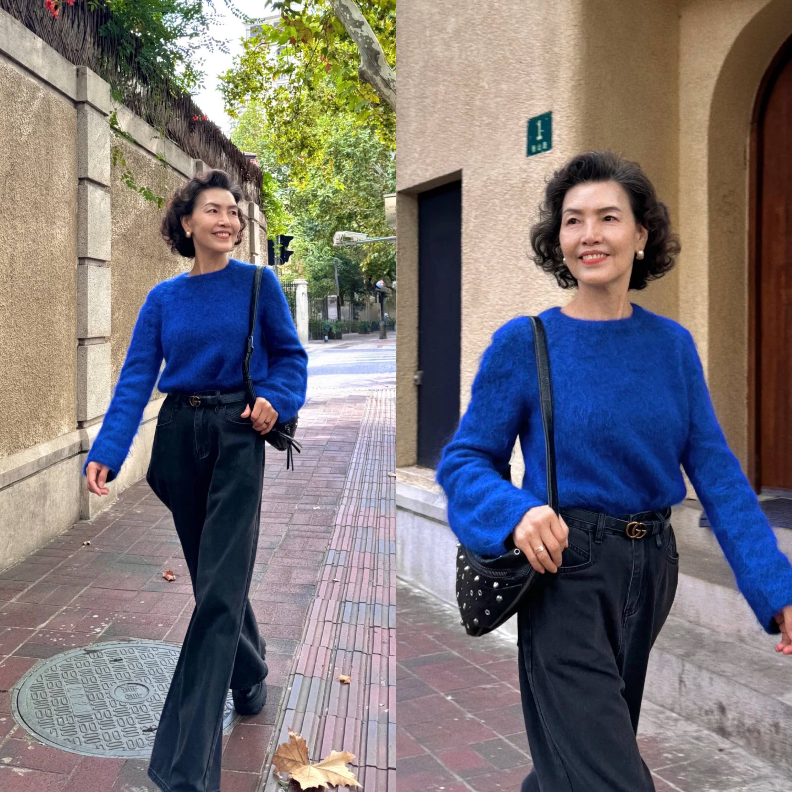 大龄女性穿搭注重简约质感,宝蓝色毛衣显白又提气色,搭配灰黑色高腰牛仔裤,利落修饰腿型,轻松拉长比例。黑色小挎包精致小巧,与牛仔裤同色系呼应,低调中显高级。整体造型简洁大方,日常通勤或休闲出街都适配。