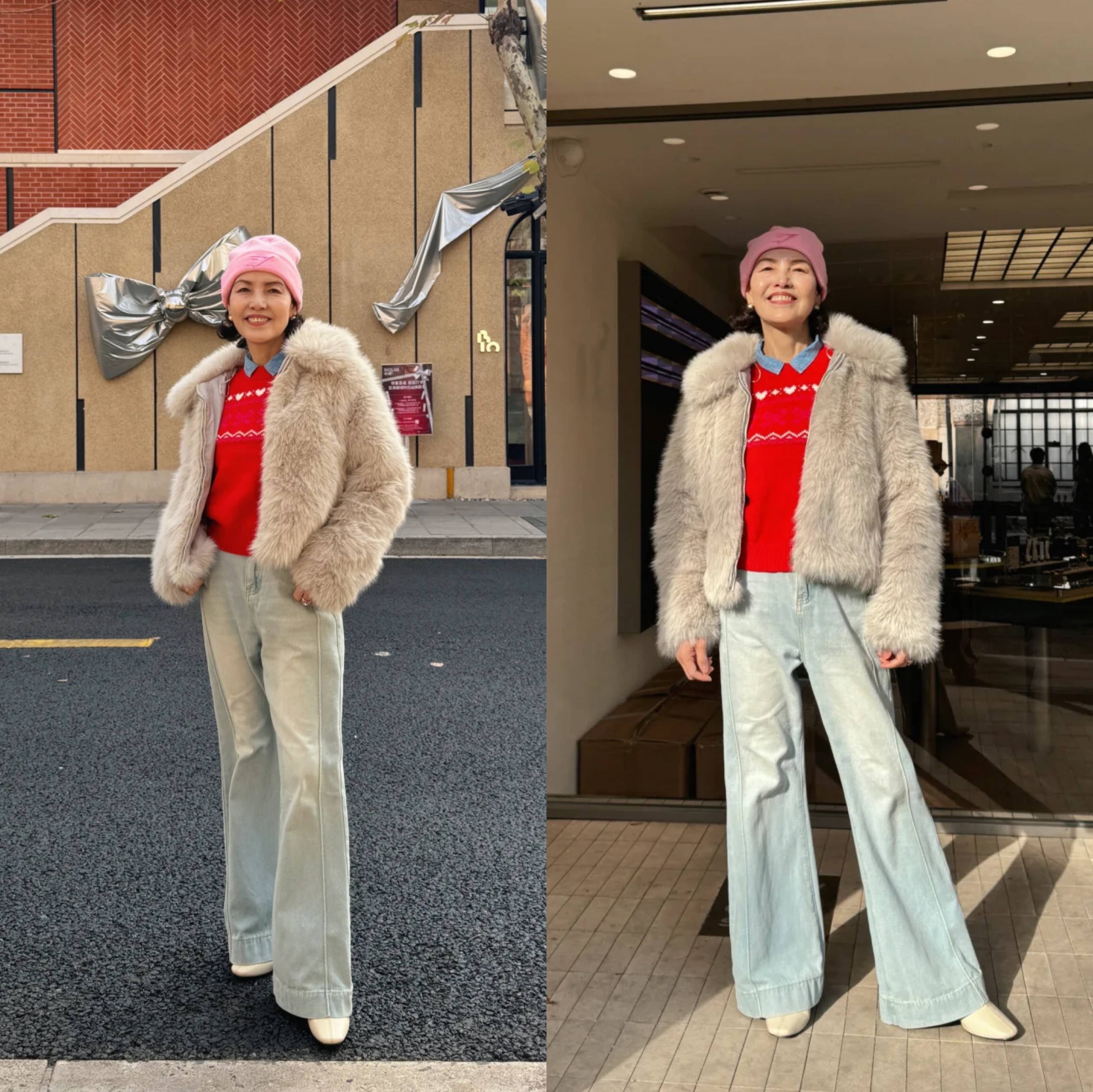 短外套也非常适合大龄女性,可大胆尝试混搭风,卡其色羊剪绒外套温暖有质感,内搭红色毛衣活力亮眼,叠穿牛仔衬衫增加层次感与休闲范。下半身浅蓝色水洗牛仔裤清新减龄,与牛仔衬衫呼应。整体穿搭既保留成熟韵味,又非常的减龄,时尚不显老。