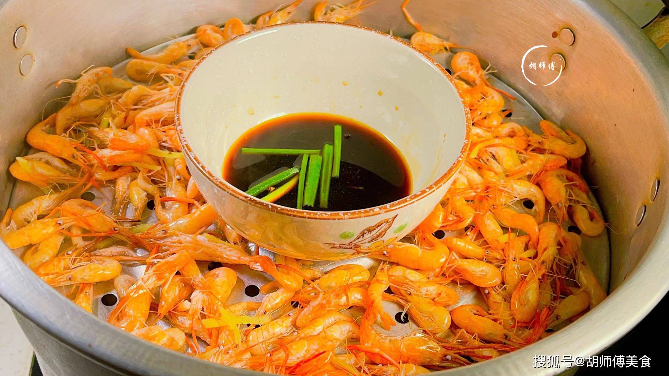 第二步:把蒸好的河虾放入盘中,然后撒上一点食盐和葱末,接着烧一勺热油,淋到葱末上,激发出它的香味。