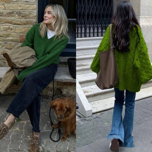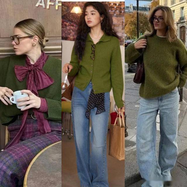 如果你有一件墨绿色的毛衣,可以配一条丹宁蓝或是藏蓝色的牛仔裤来穿,蓝+绿的配色,充满了沉静贵气的味道,又带着些复古的腔调,很时髦。