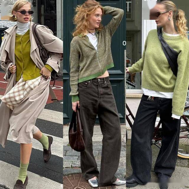 如果你衣柜已有基础款皮衣和直筒裤,只需加入一件低饱和绿色单品即可完成升级。例如:
