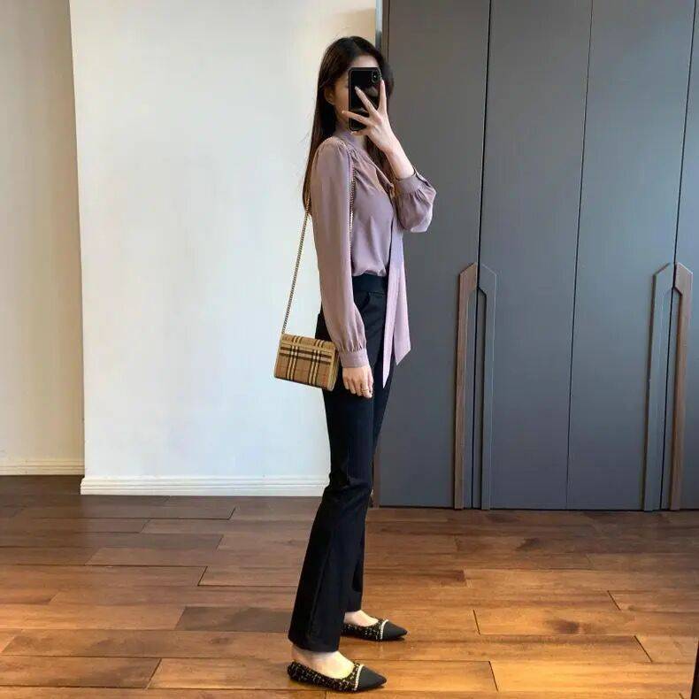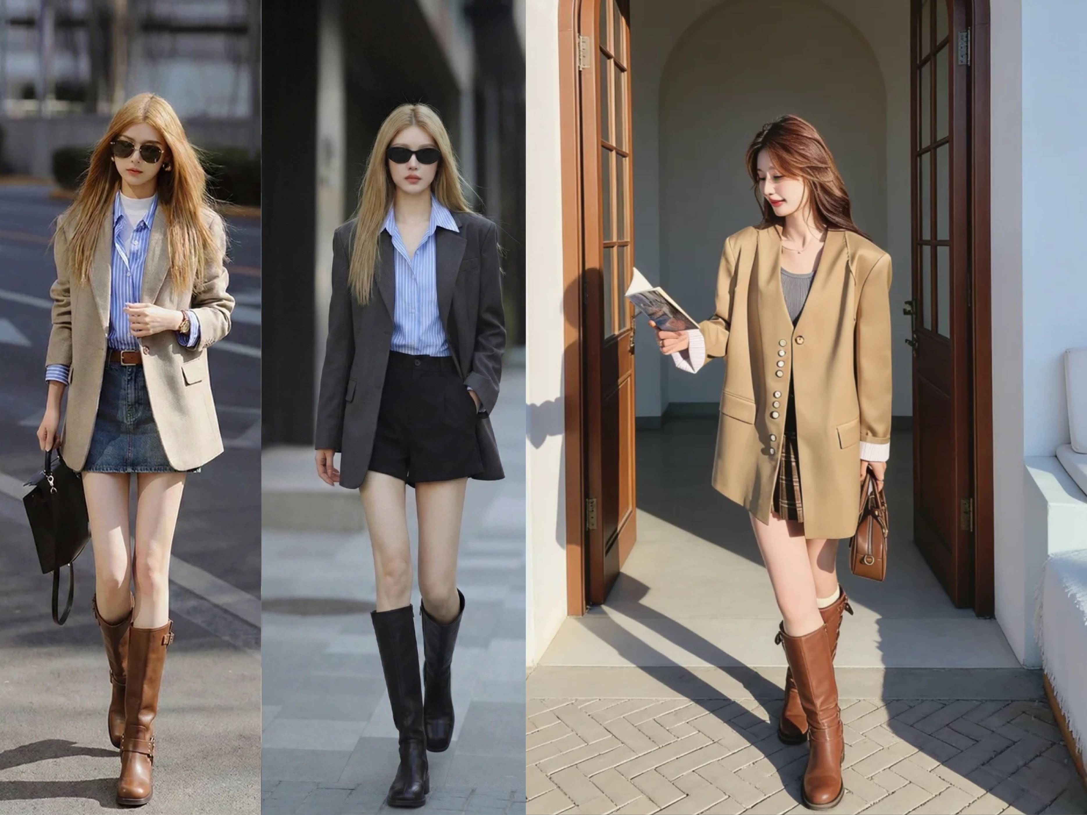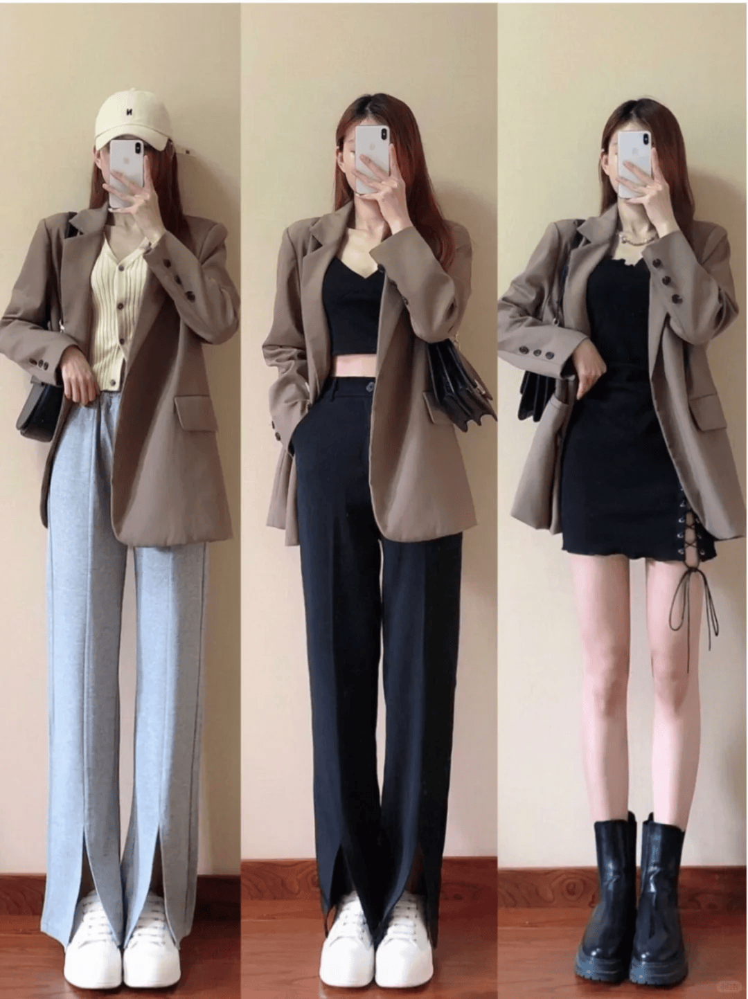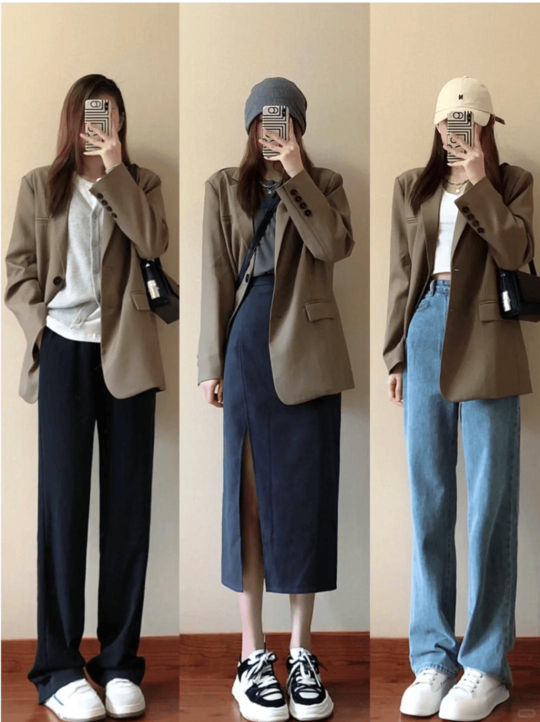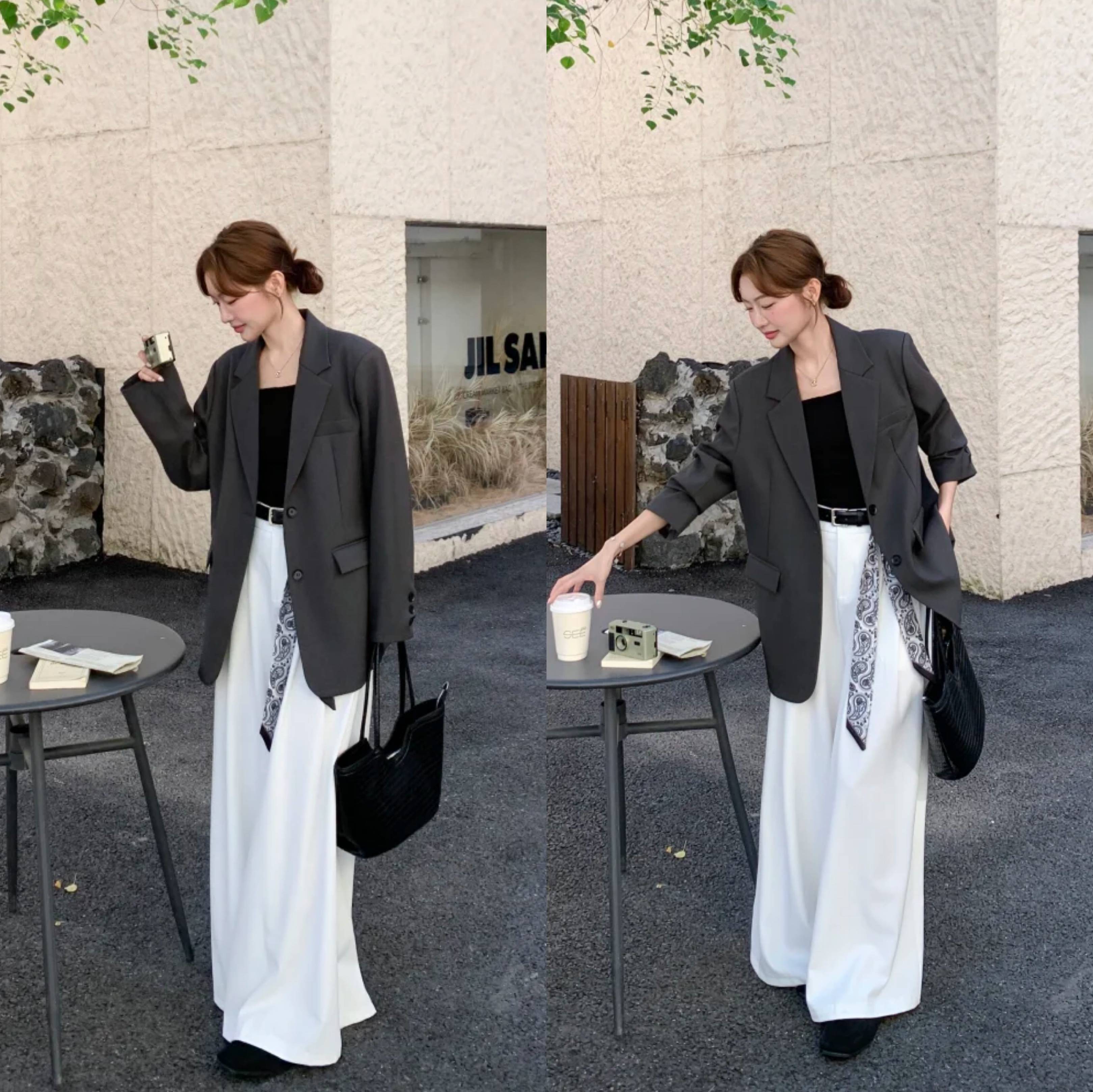 西装+直筒休闲裤:灰色高腰裤强化干练感,适合职场。