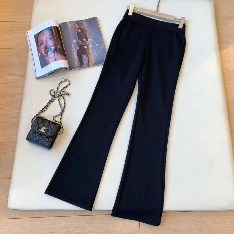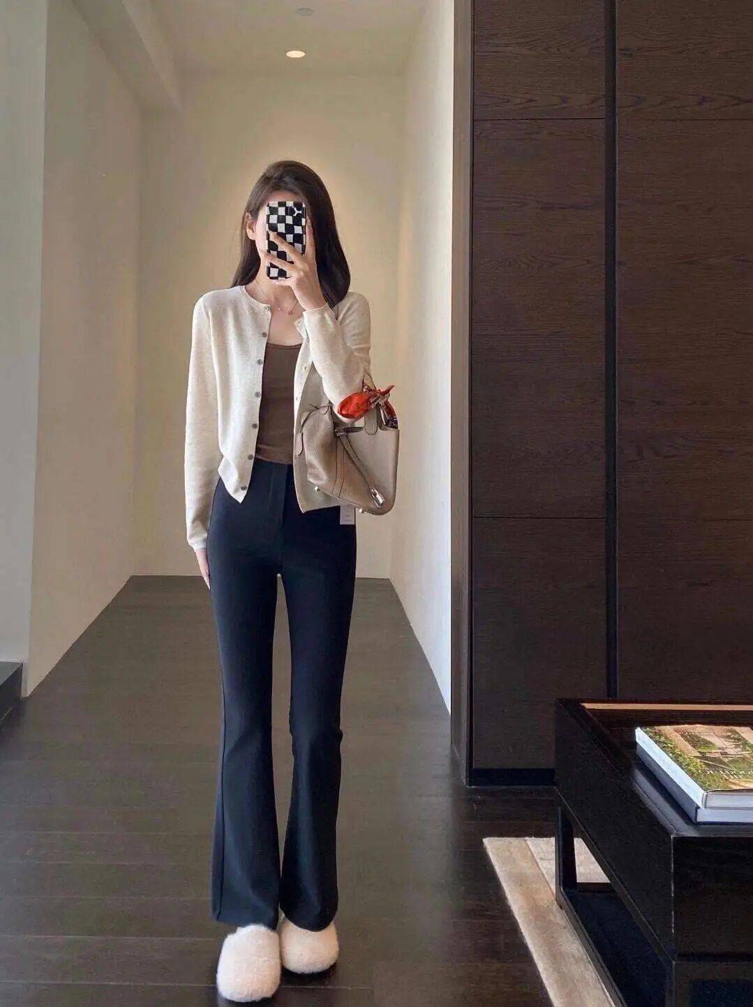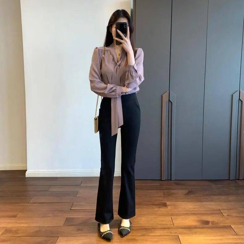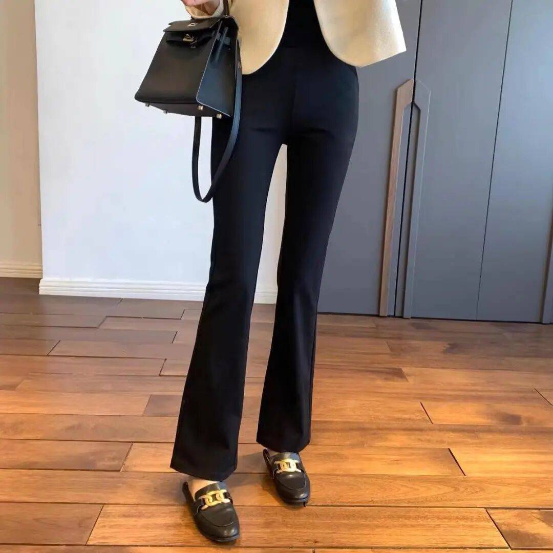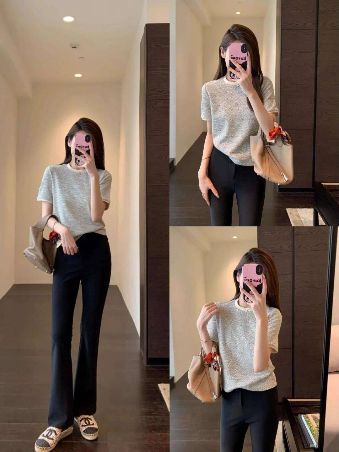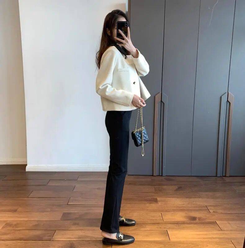 西装+直筒休闲裤:灰色高腰裤强化干练感,适合职场。