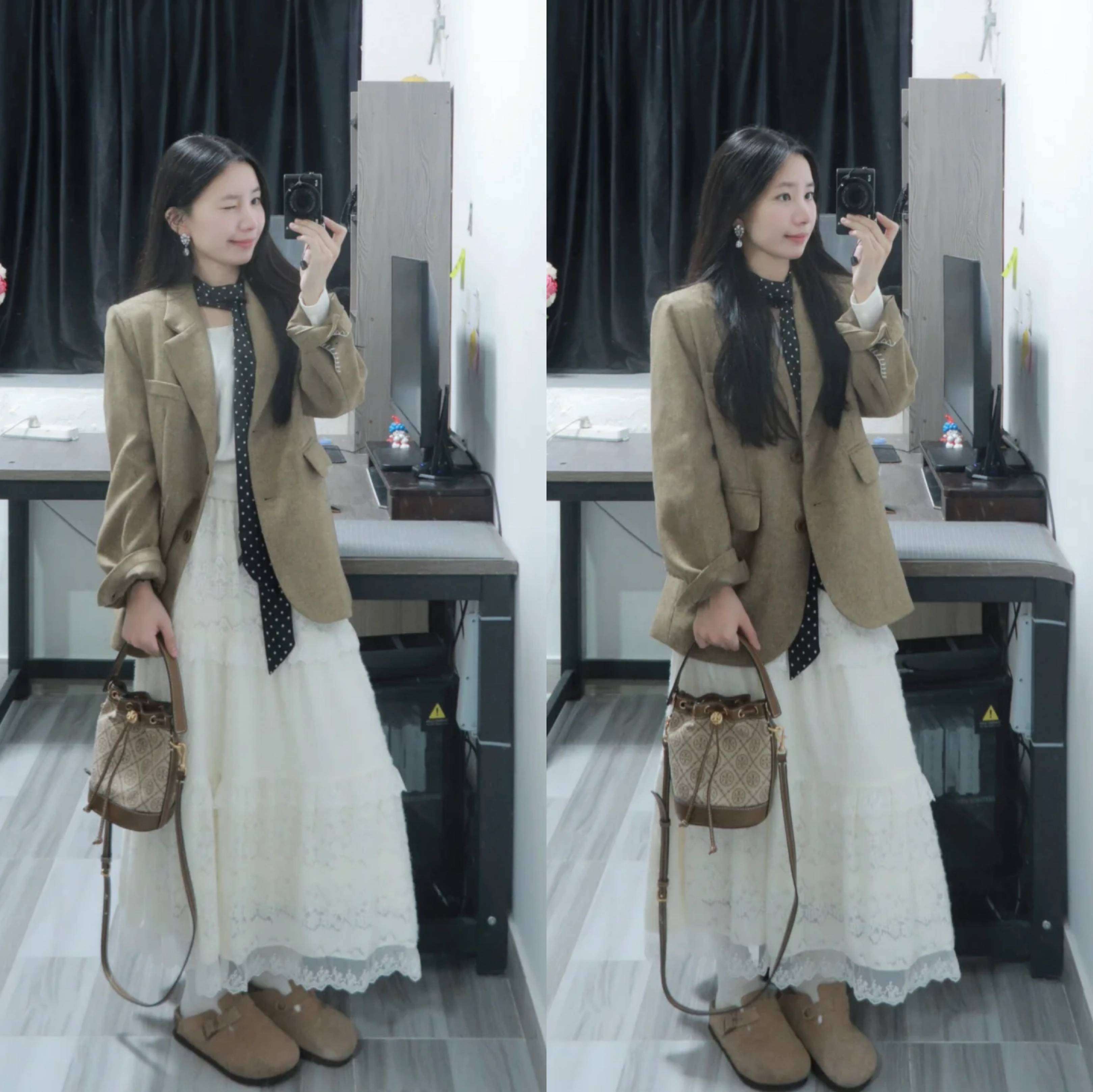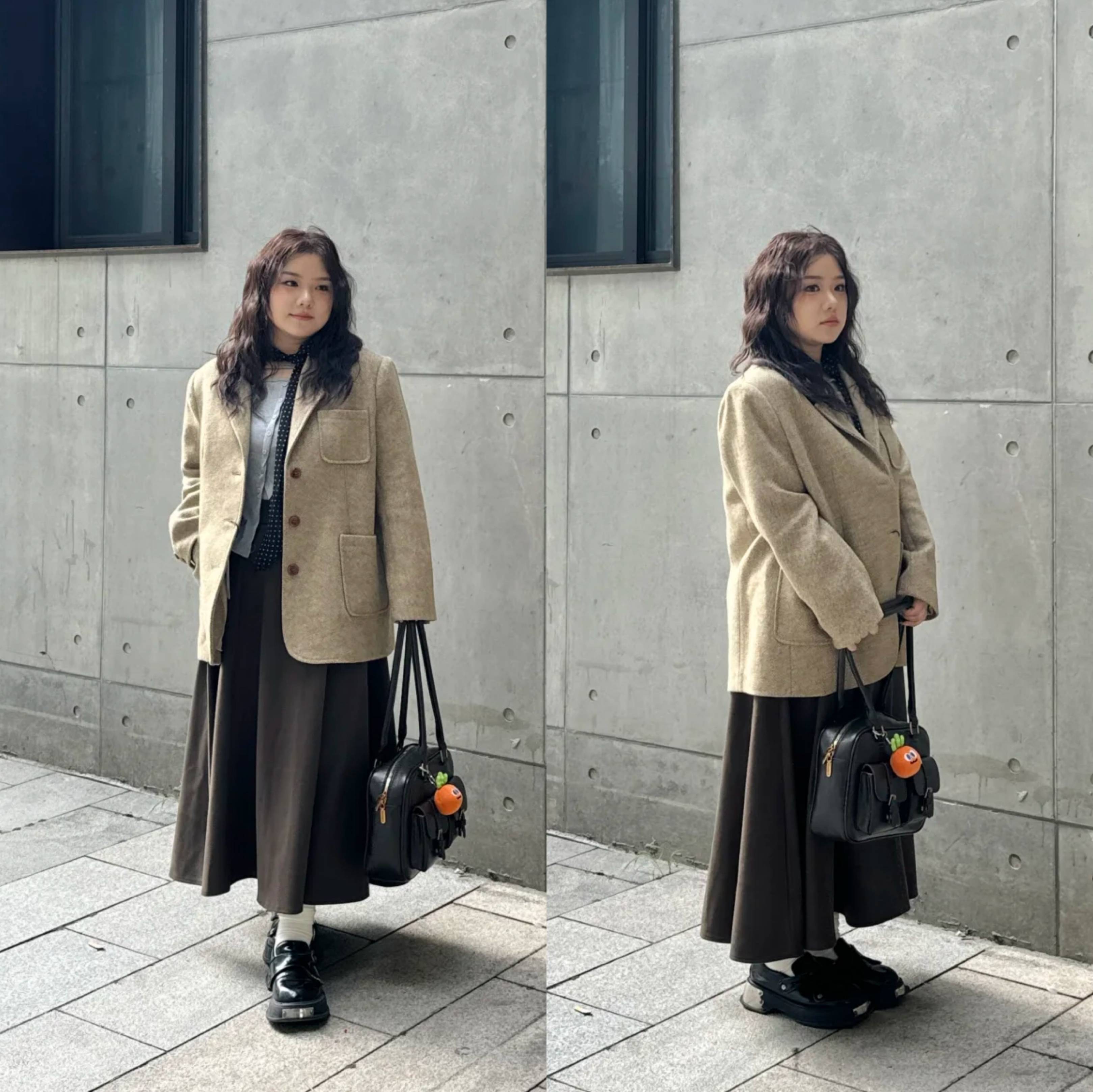 卡其色西装+深灰百褶裙:微宽松版型遮肉,长度至脚踝显高,适合小个子和微胖身材。
