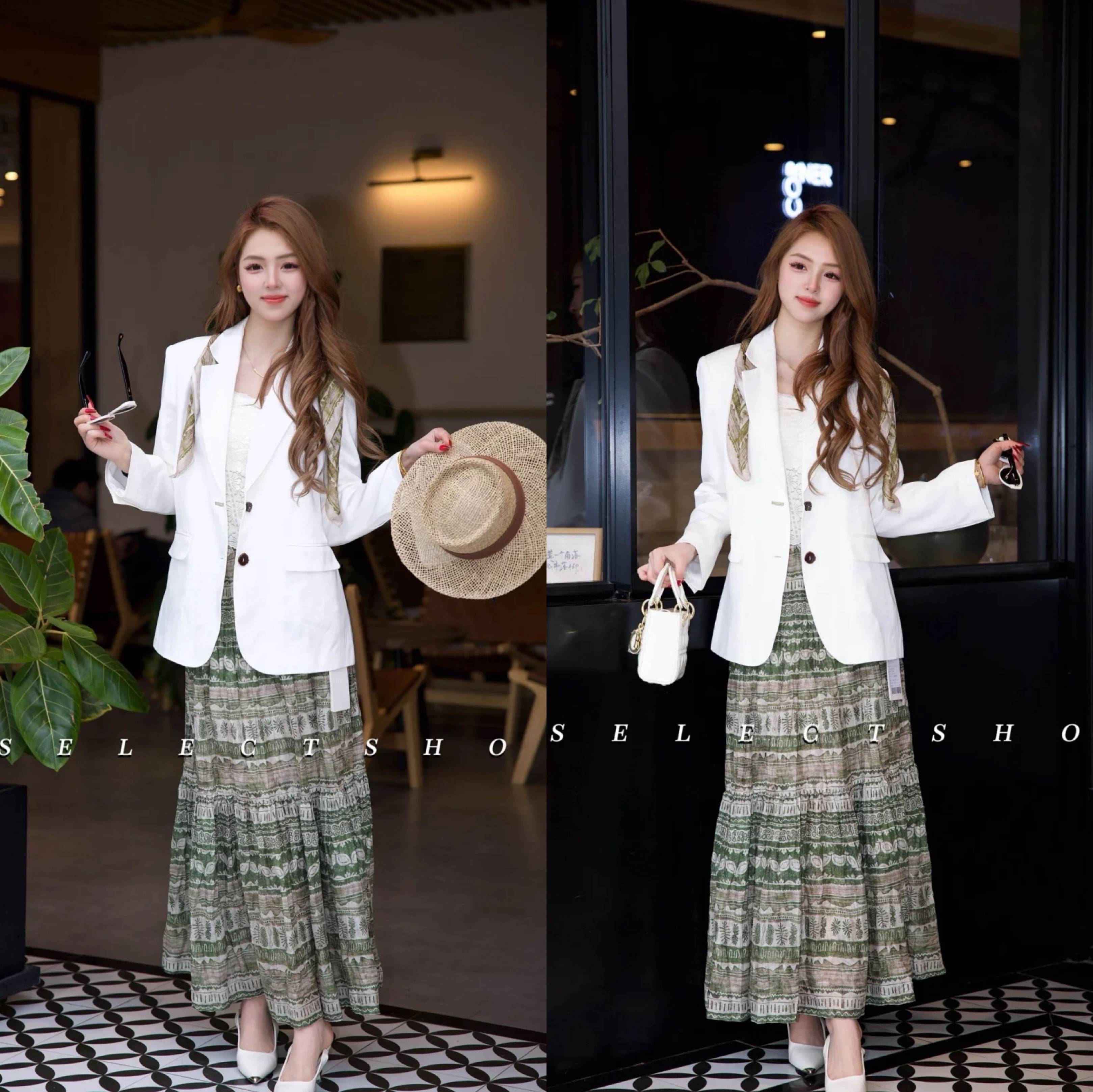 纯色西装内搭碎花裙(如白西装+绿色碎花裙),用简约外套平衡花色,打造春日浪漫氛围。