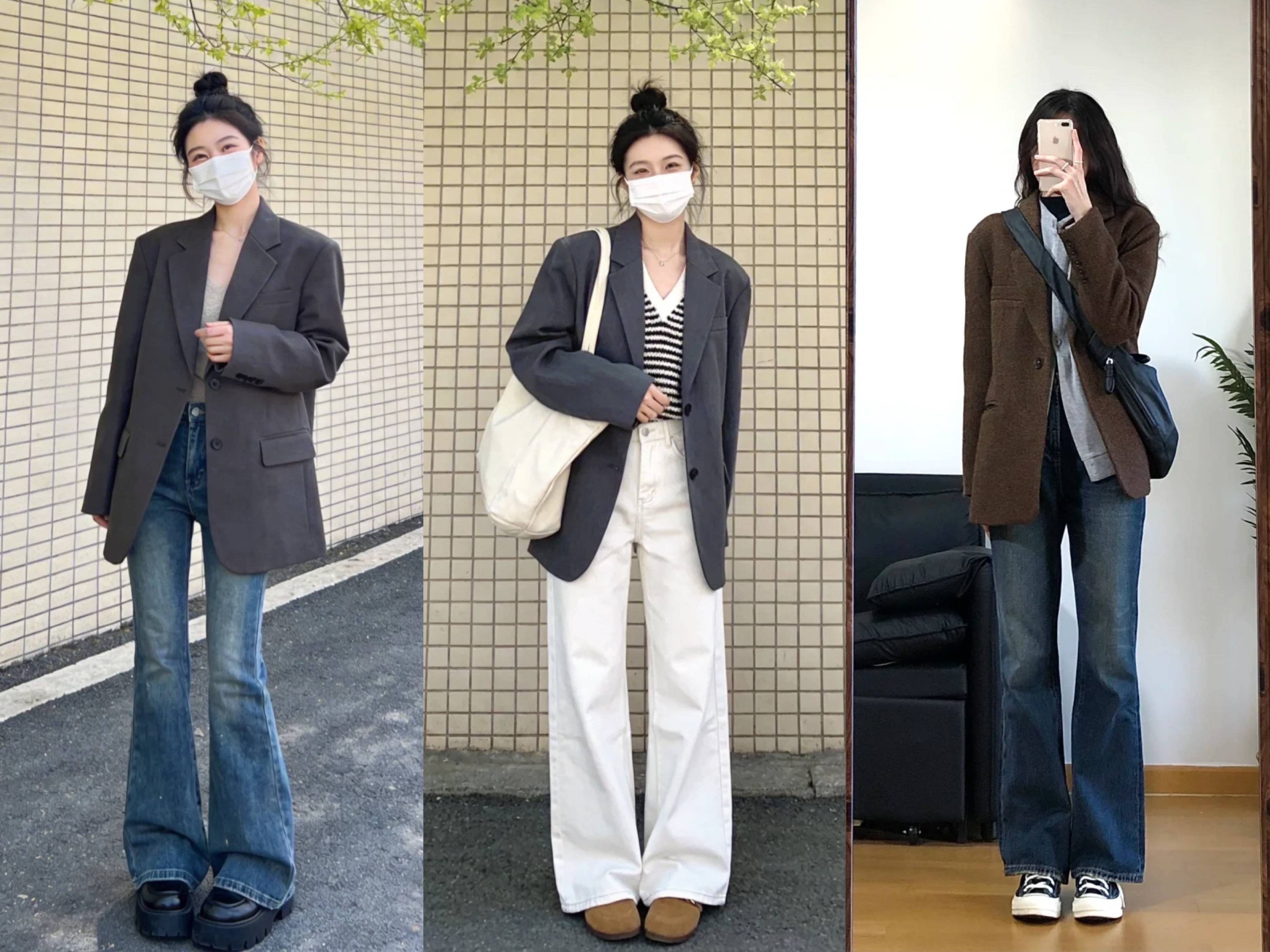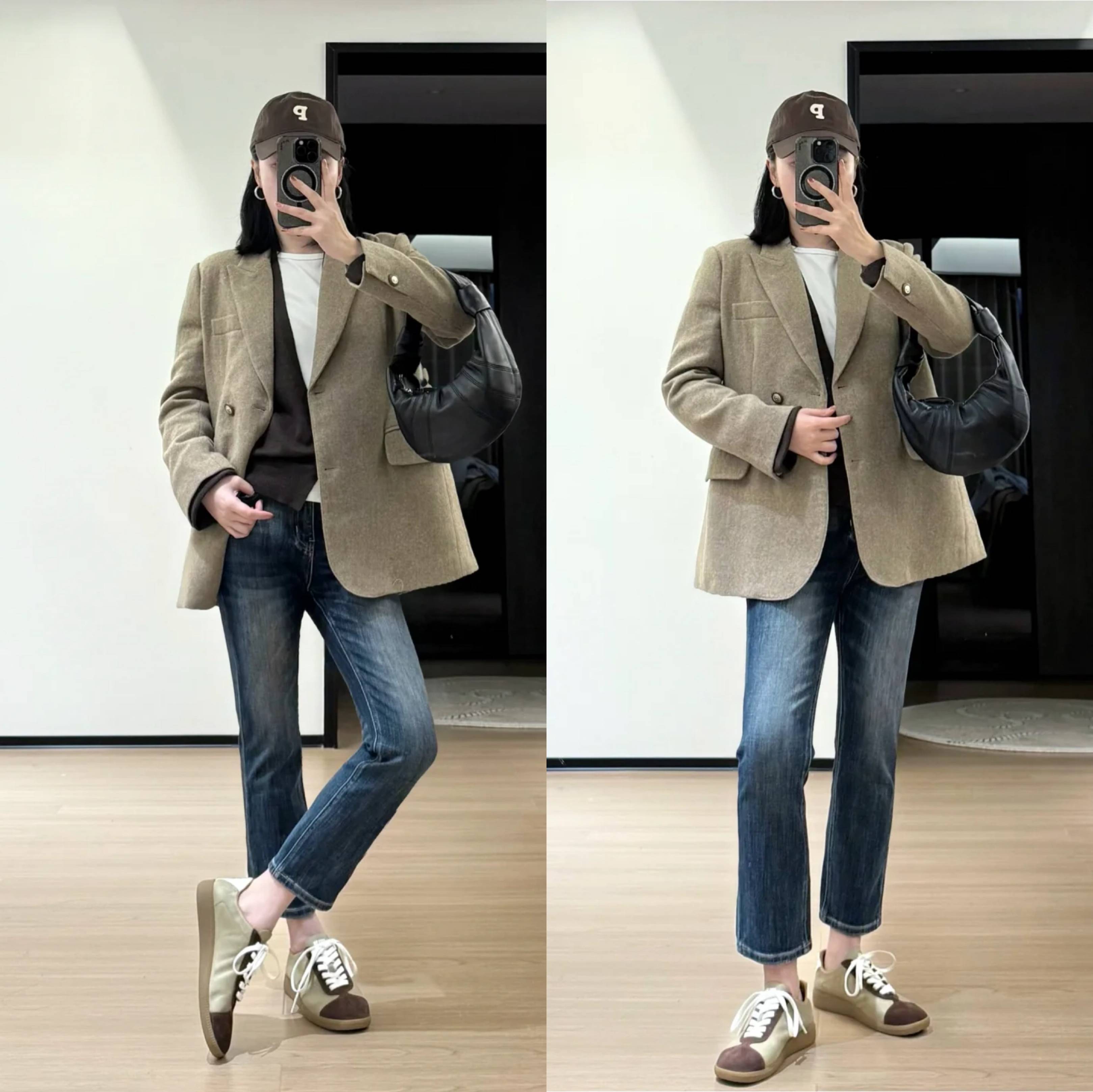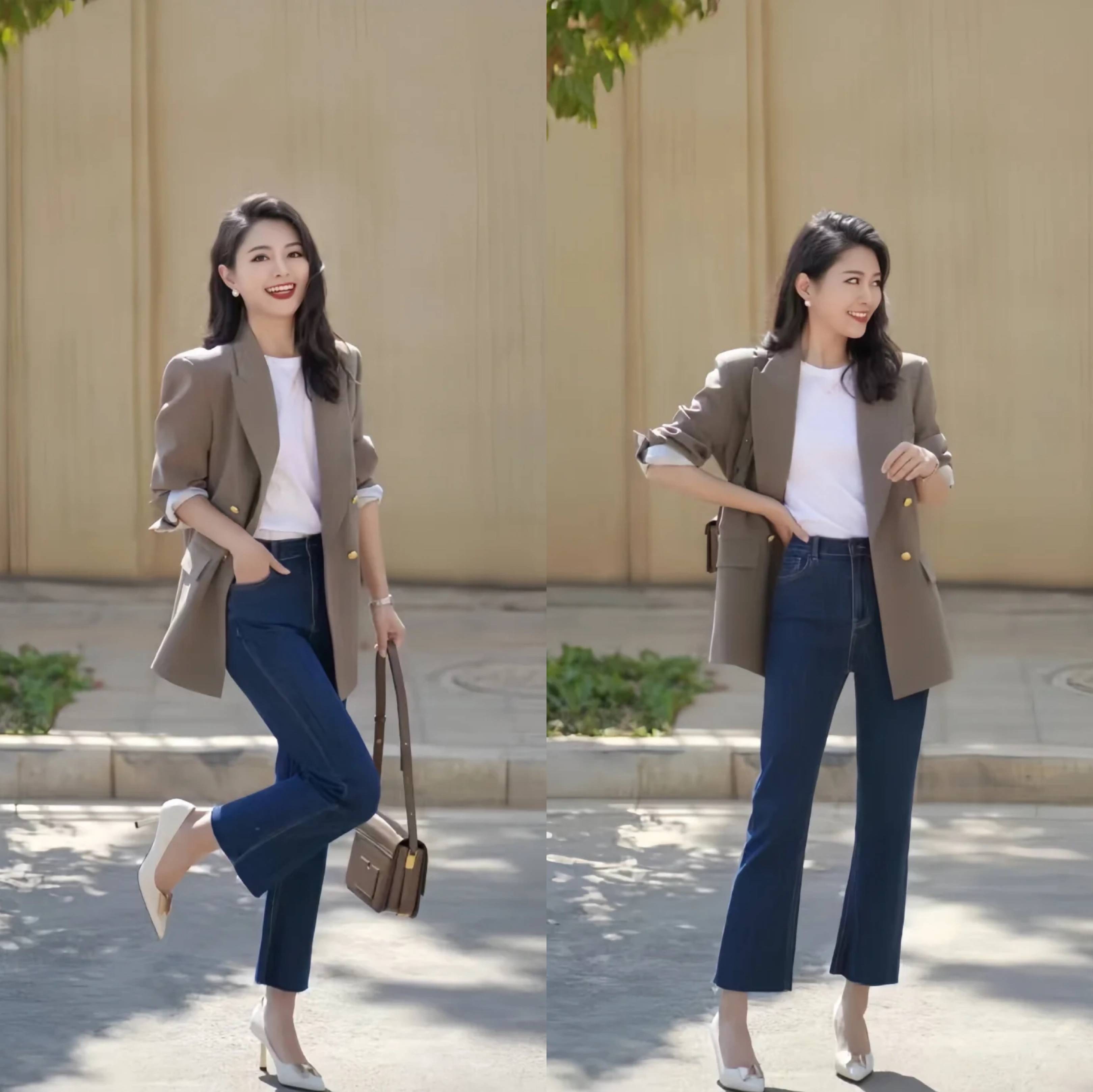 西装+牛仔裤:九分裤露脚踝,搭配卡其色平底鞋,休闲利落。