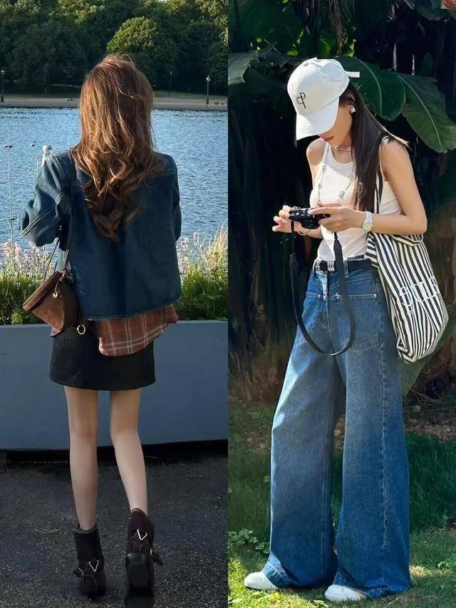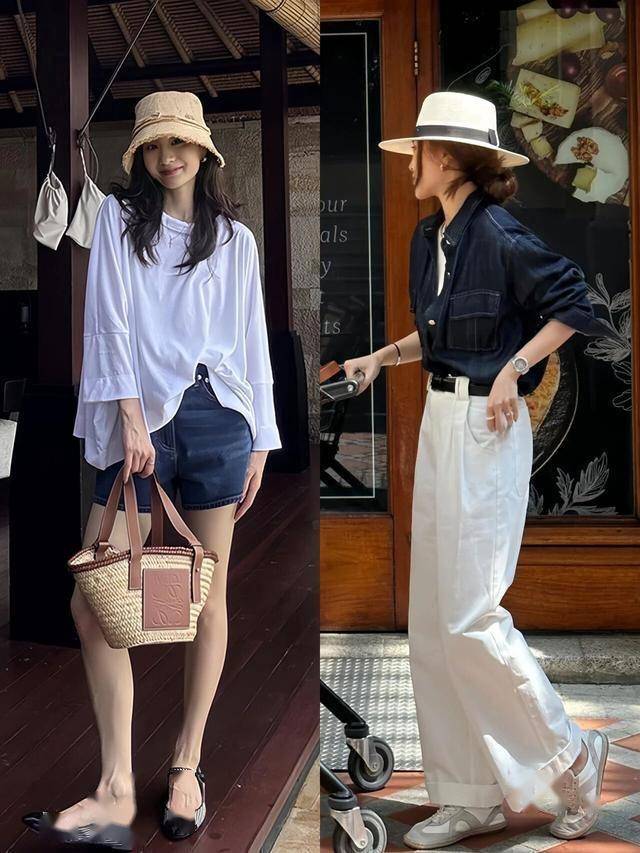 克莱因蓝衬衫+白色阔腿裤,冷调清新显高级。