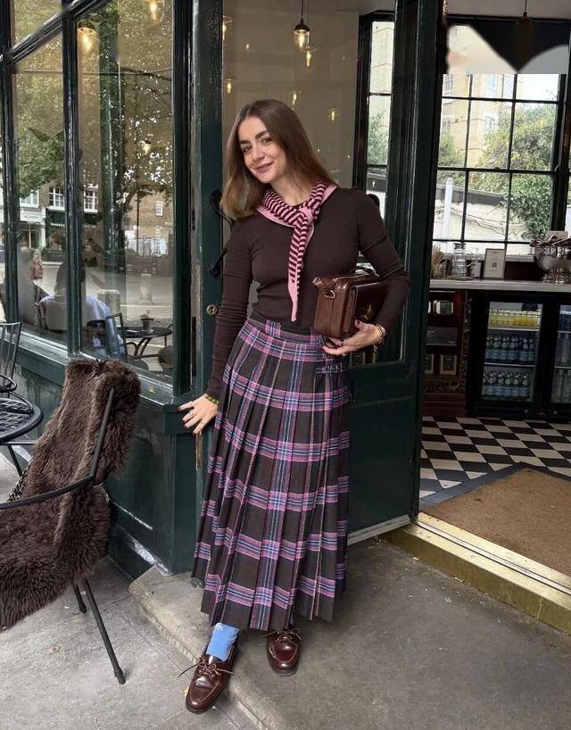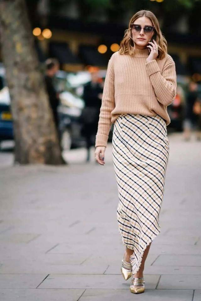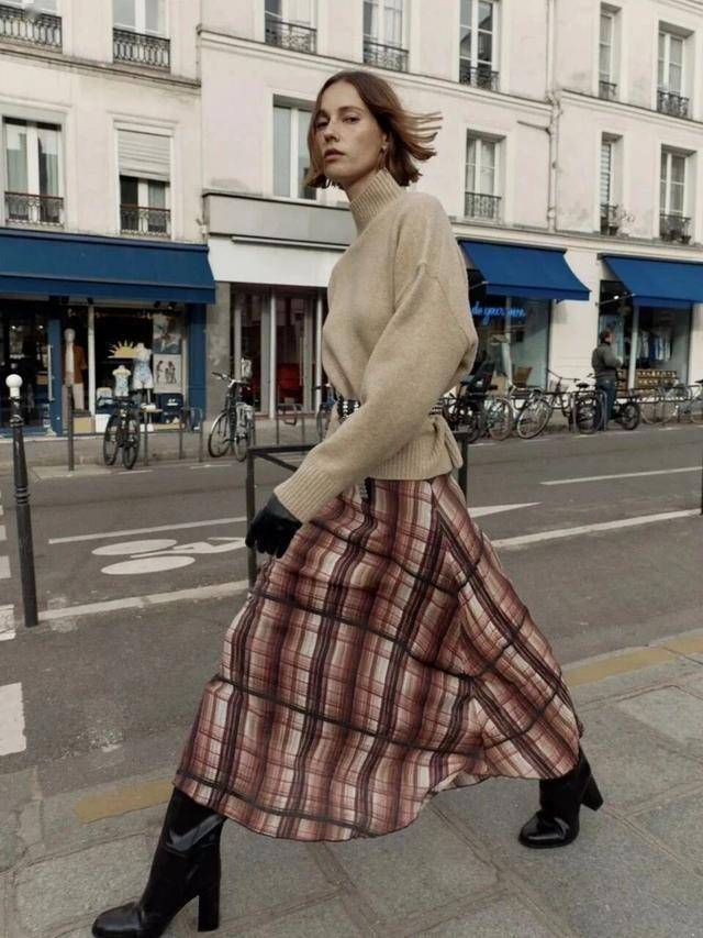 V领上衣+小丝巾填补脖颈留白,优雅不空洞;高腰伞裙+短款针织衫,小个子显高利器。