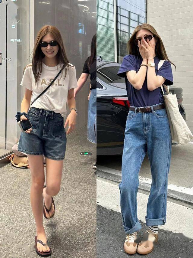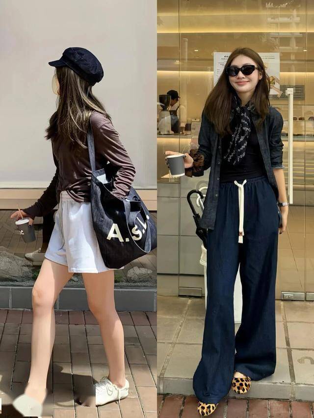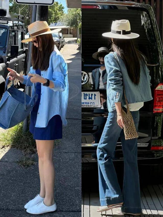 亮蓝色亚麻衬衫配浅灰色开衩阔腿裤,清爽随性;或选择垂感西装裤拉长比例,通勤不呆板。